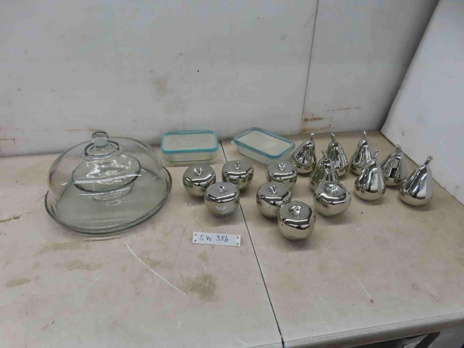 large glass serving tray, 14 silver glass ornaments, 2 snap top glass square food containers