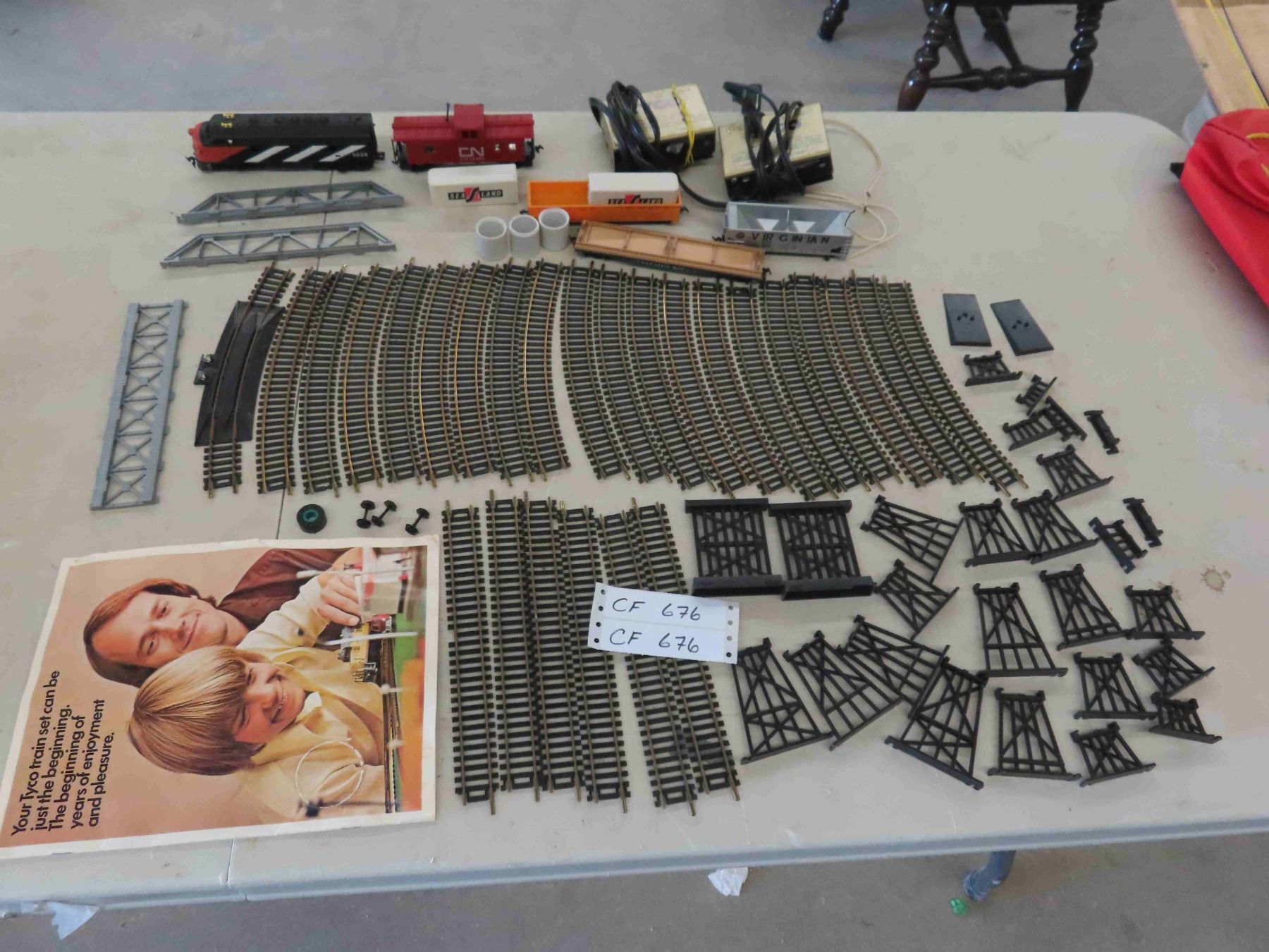 model train engine, caboose, tracks, transformers, scale.