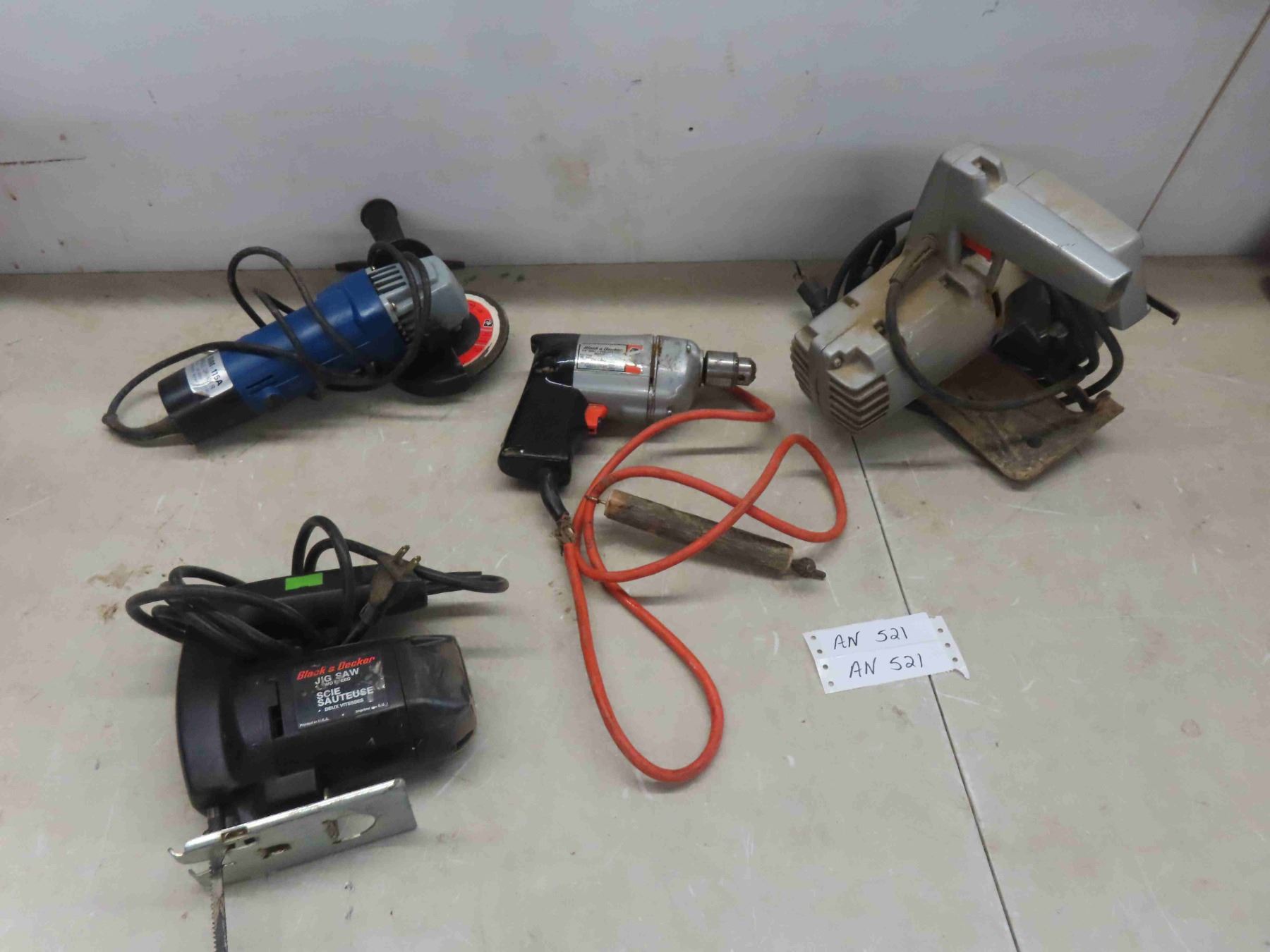 power tools 7 1/4" circular saw, jiogsaw 3/8" drill and angle grinder