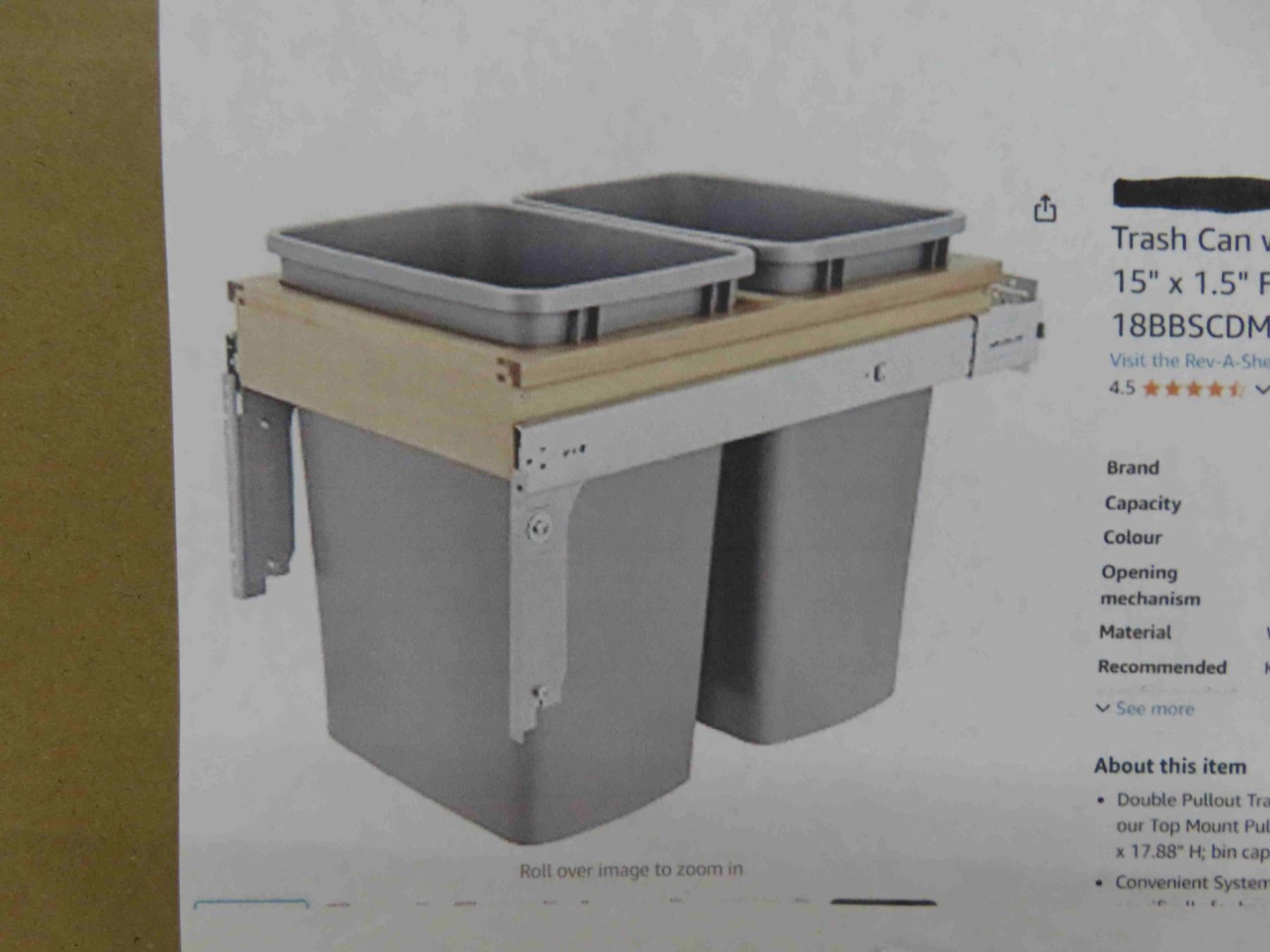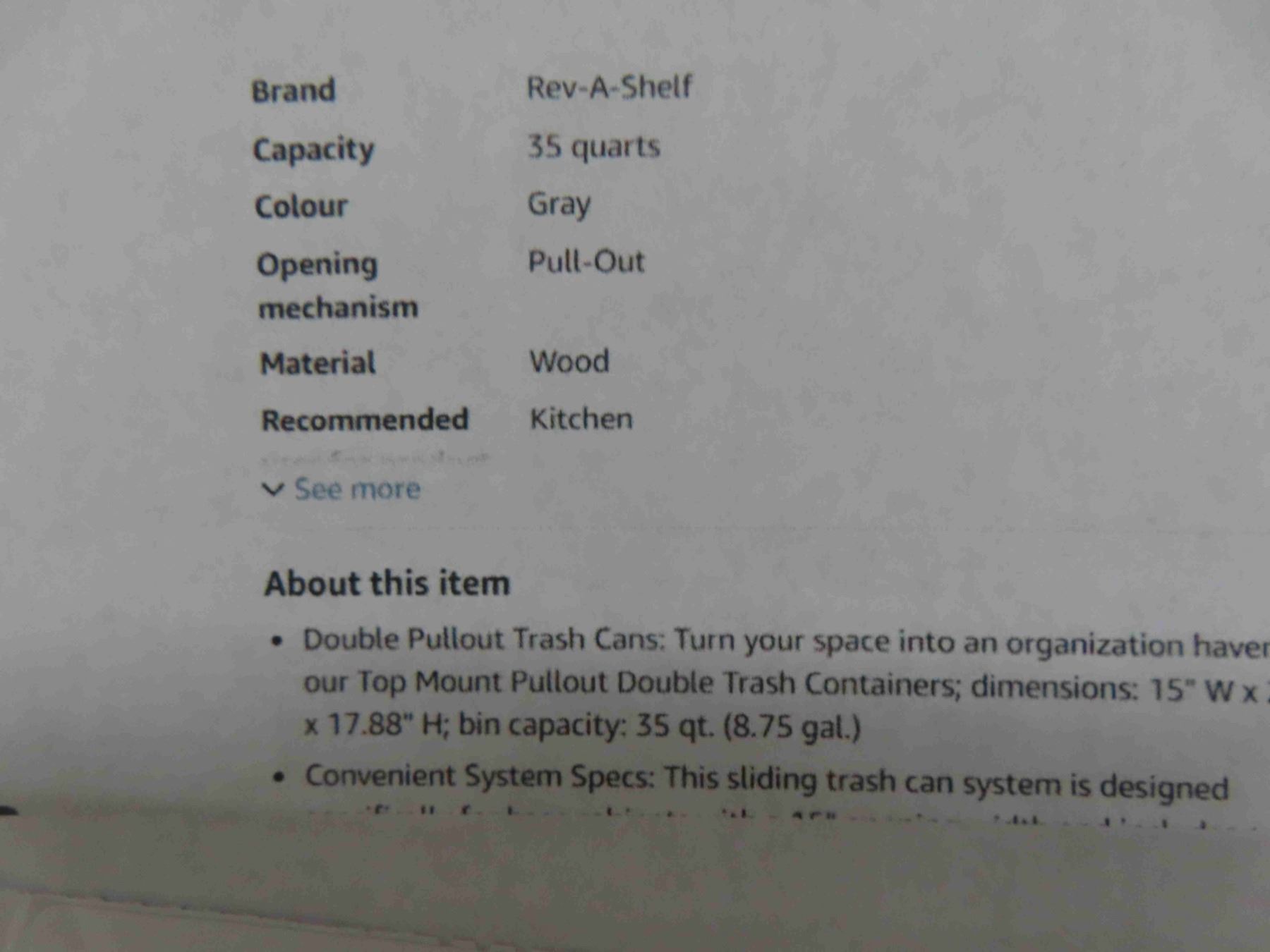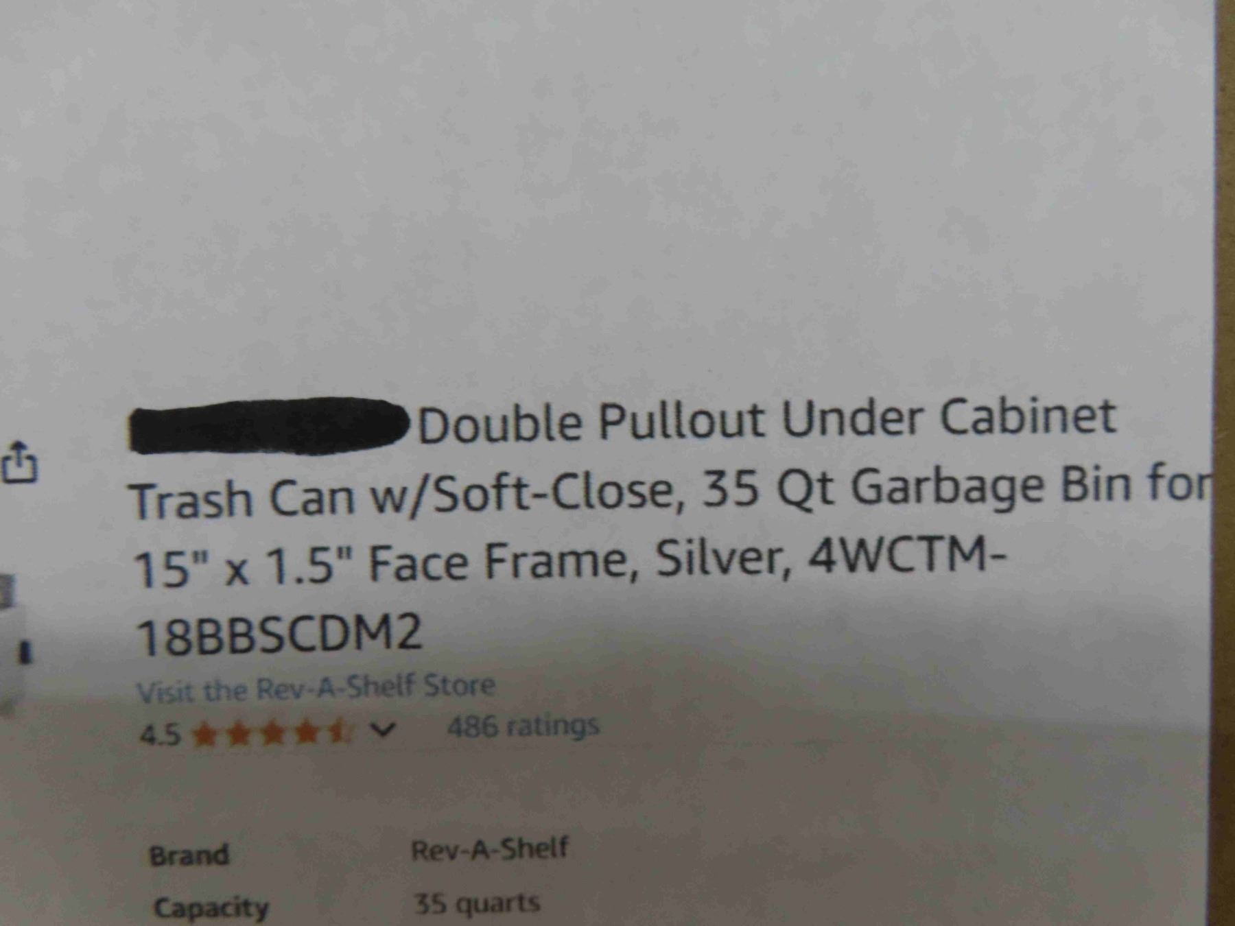 rev-a-shelf double pullout under cabinet trash can with soft-close, 35 qt garbage bin for 15"x 1.5" face frame, silver 4WCTM-18BBSCDM2 New or Store Return