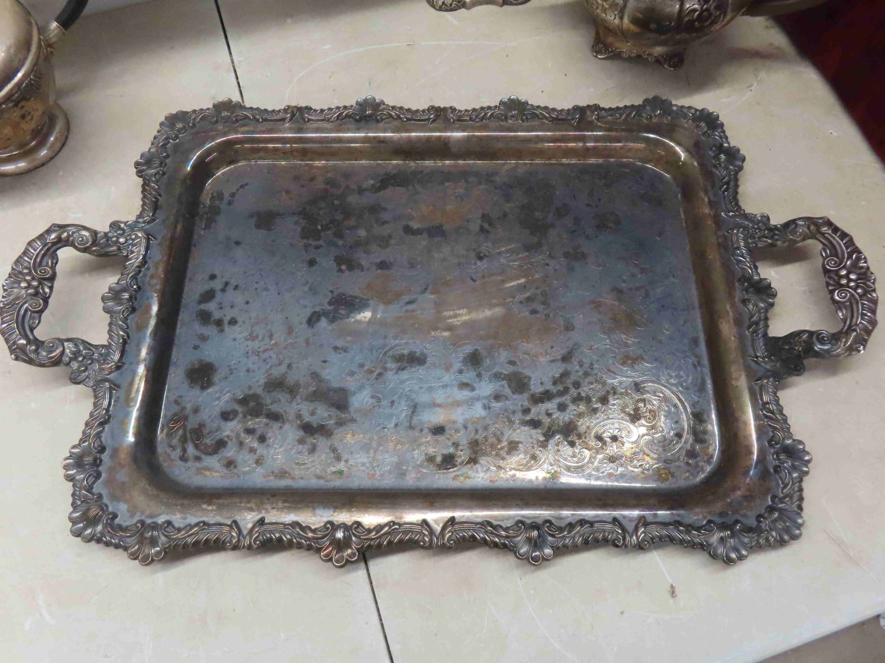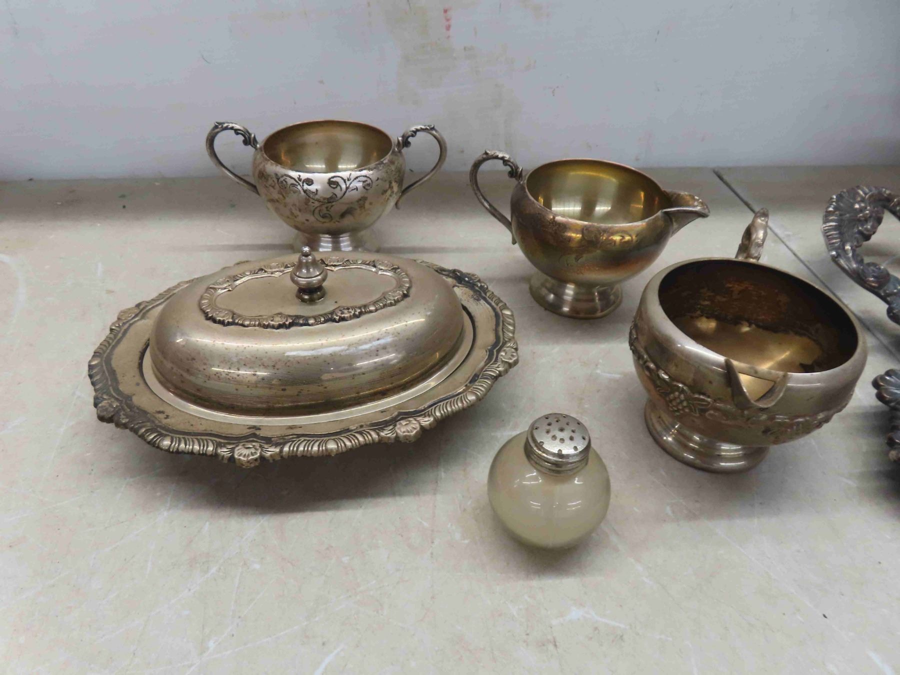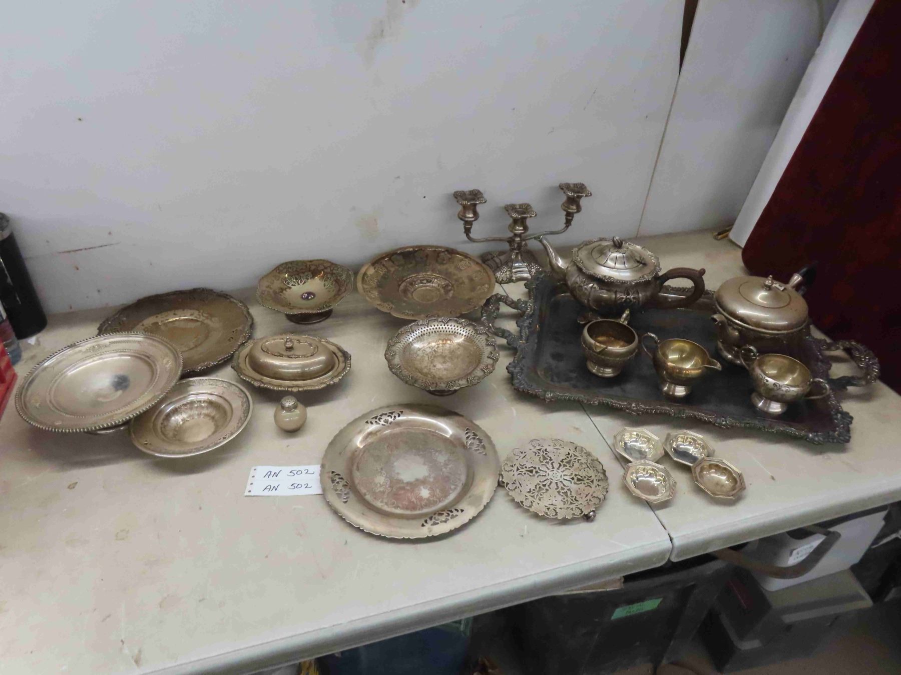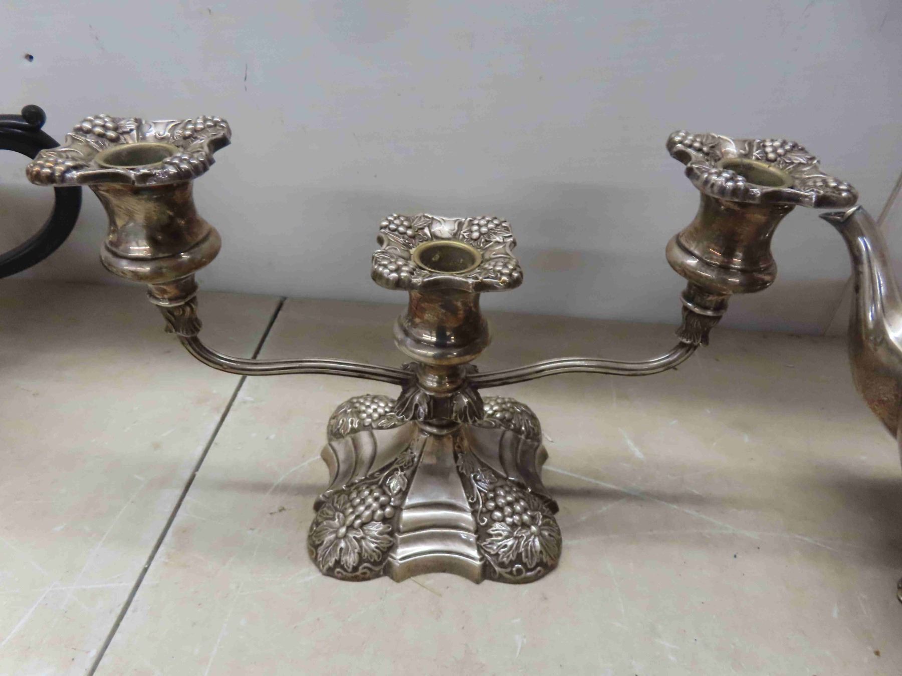 silver platted tea pot, creamer, sugar bowl, tray, candelbra, serving plates and more