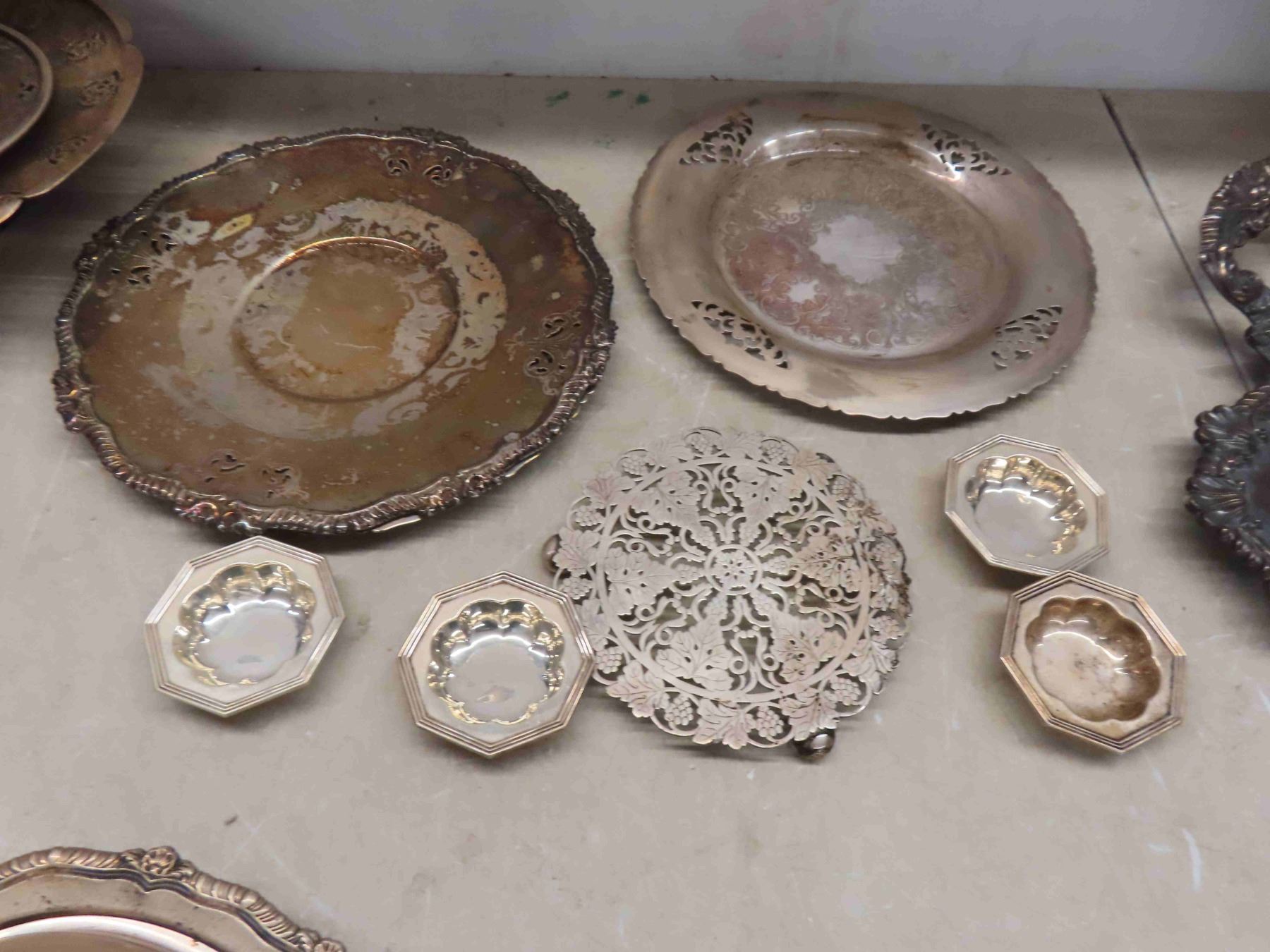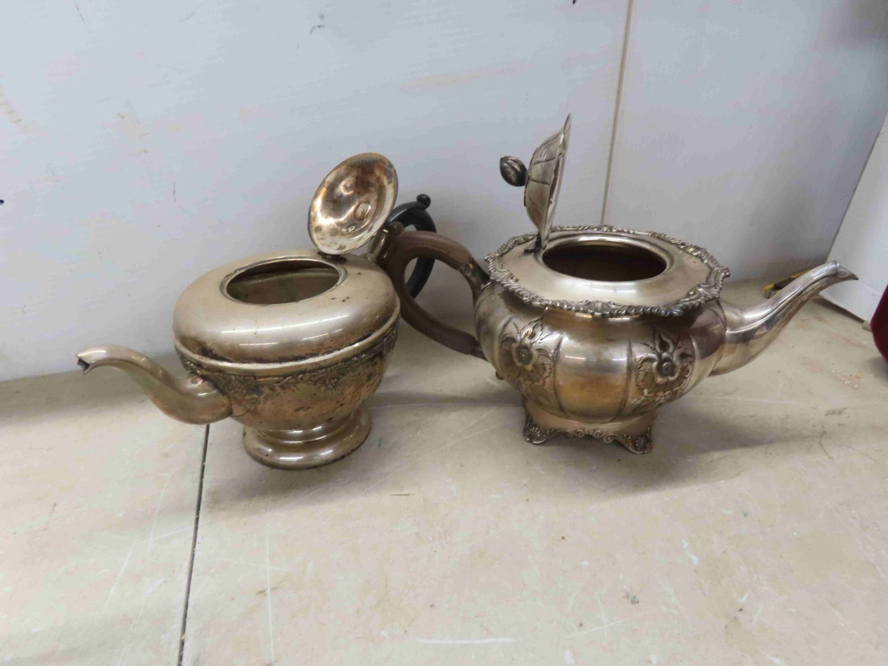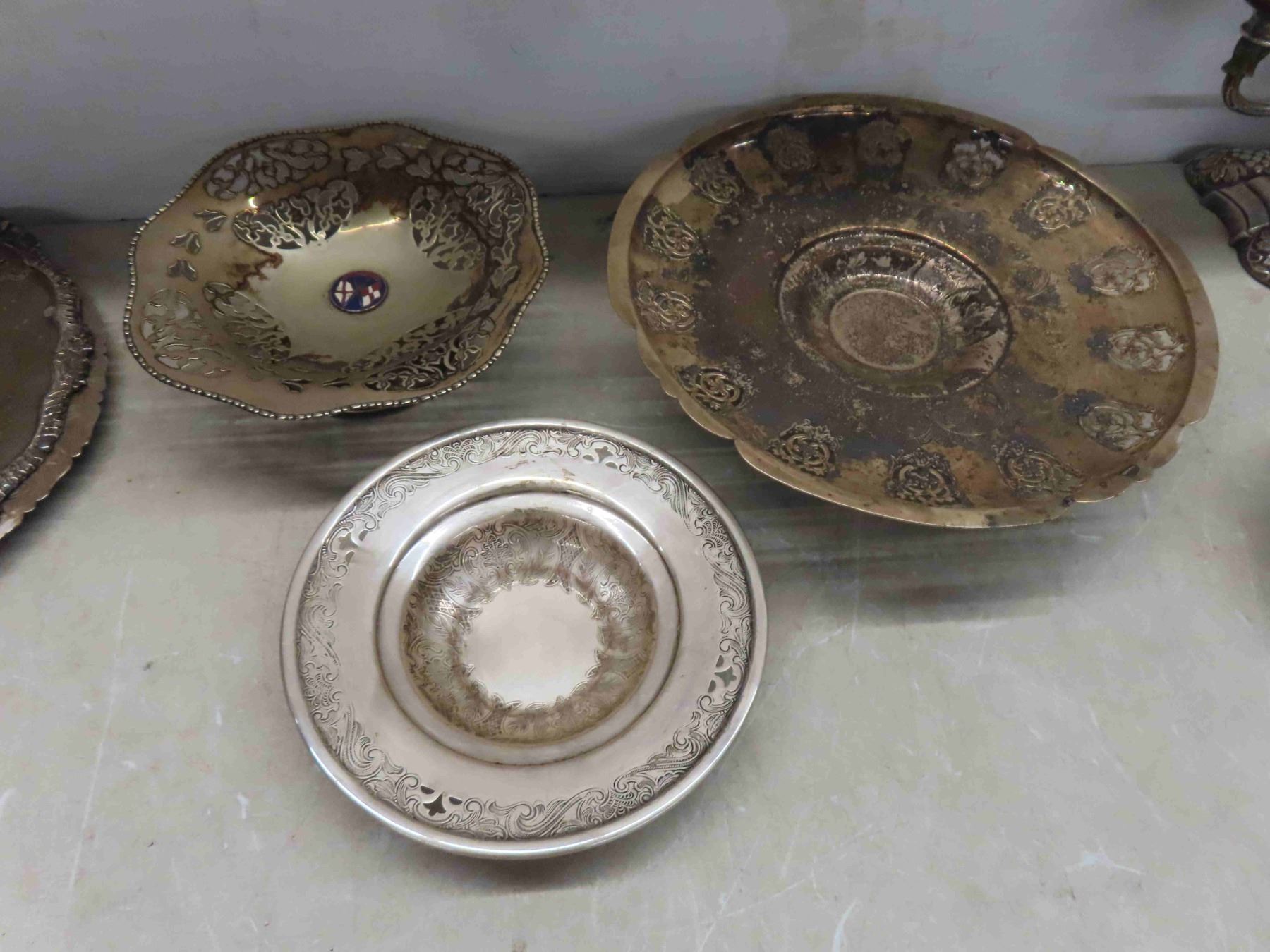 silver platted tea pot, creamer, sugar bowl, tray, candelbra, serving plates and more