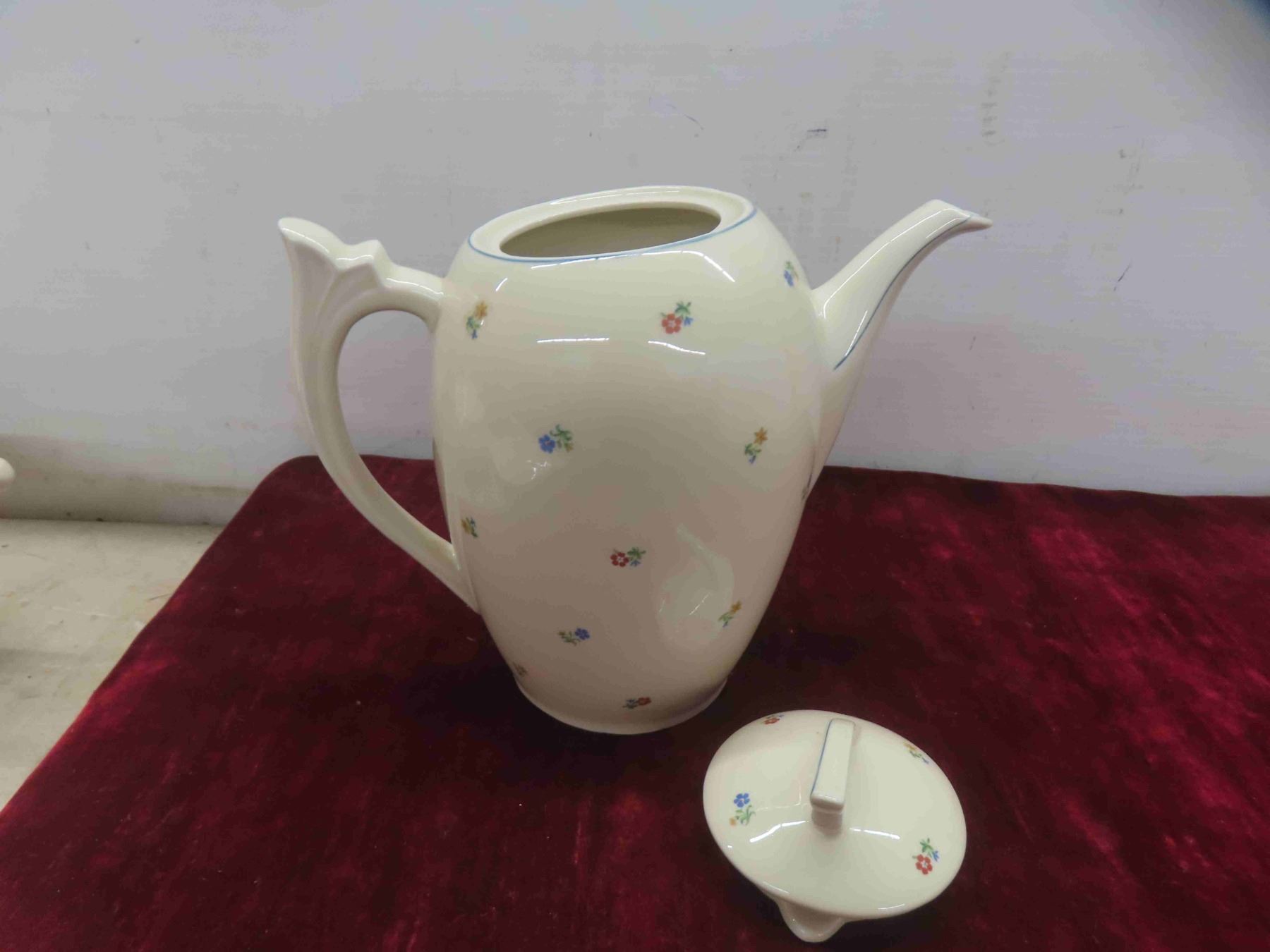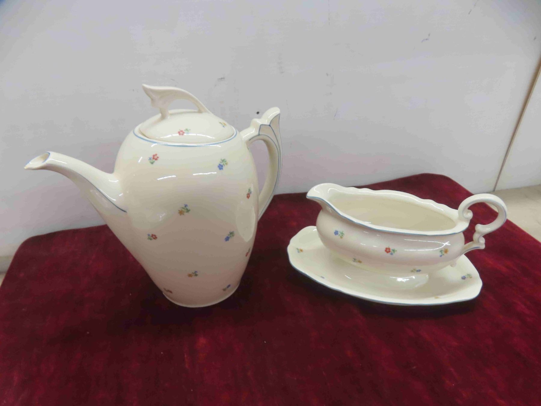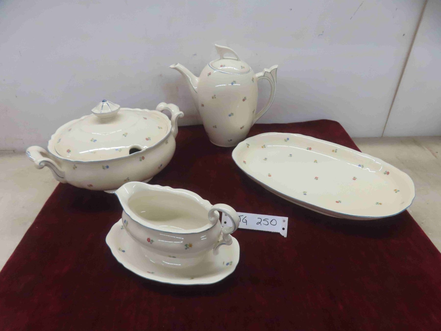 soup tureen and platter, tea or coffeer pot, and a gravy boat. There is a chip on the spout of the coffee pot the pattern is not known but was used in the 1950s