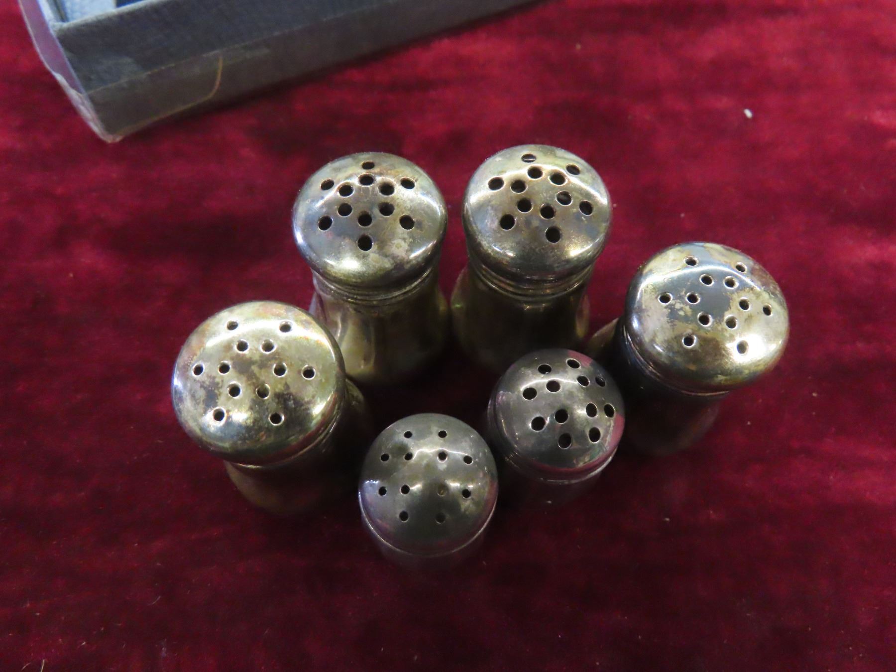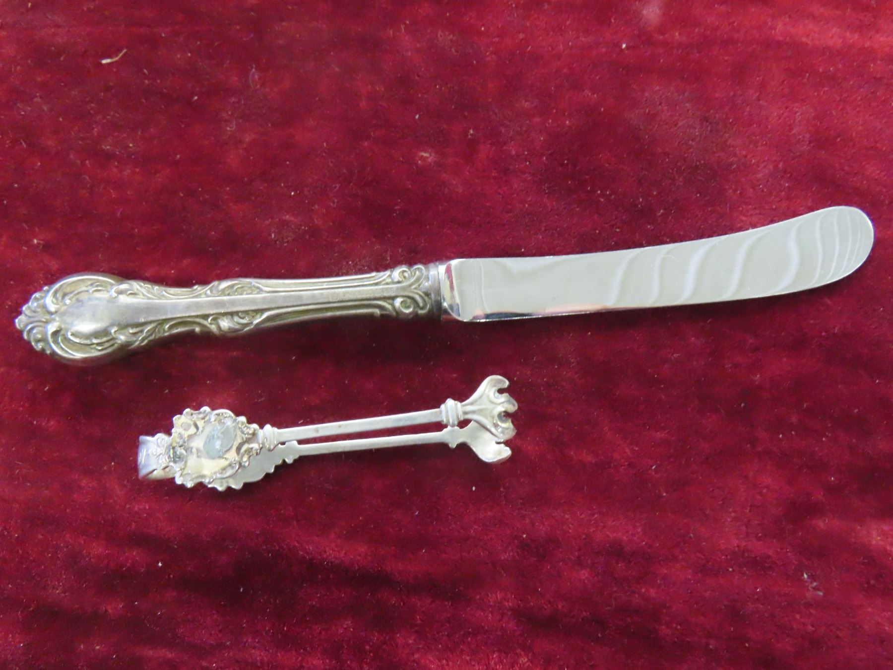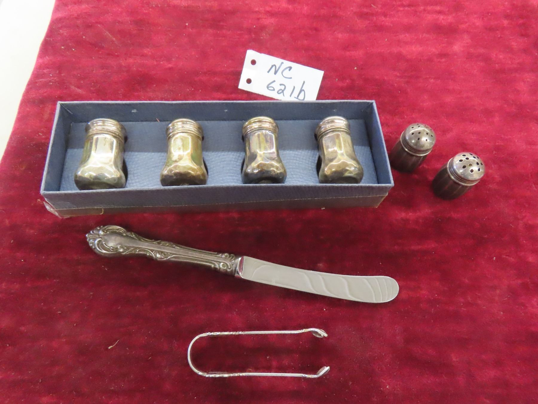 sterling items, 6 salt and pepper shakers, knife and tongs