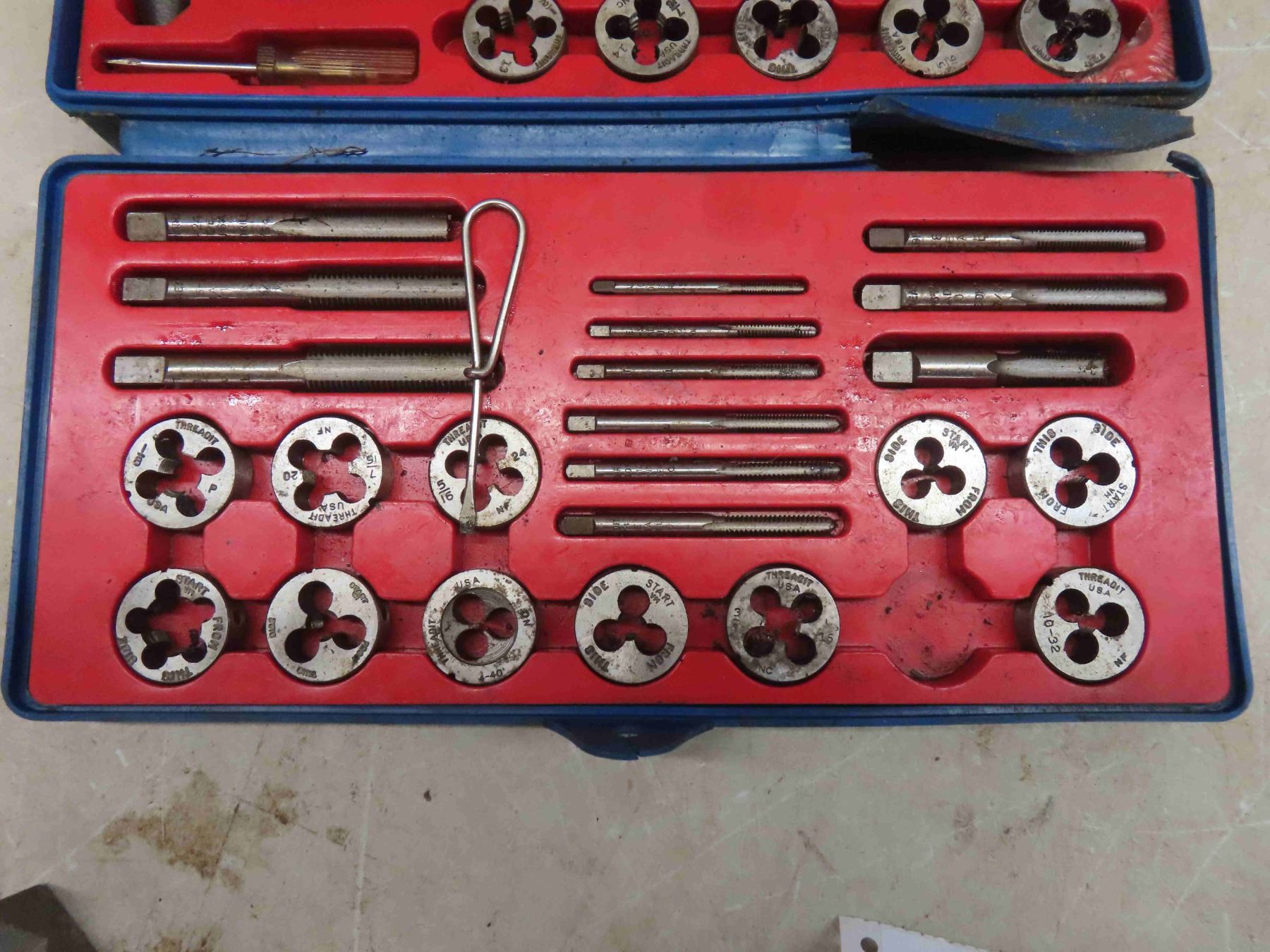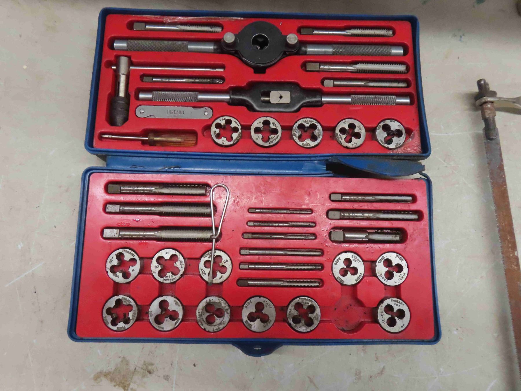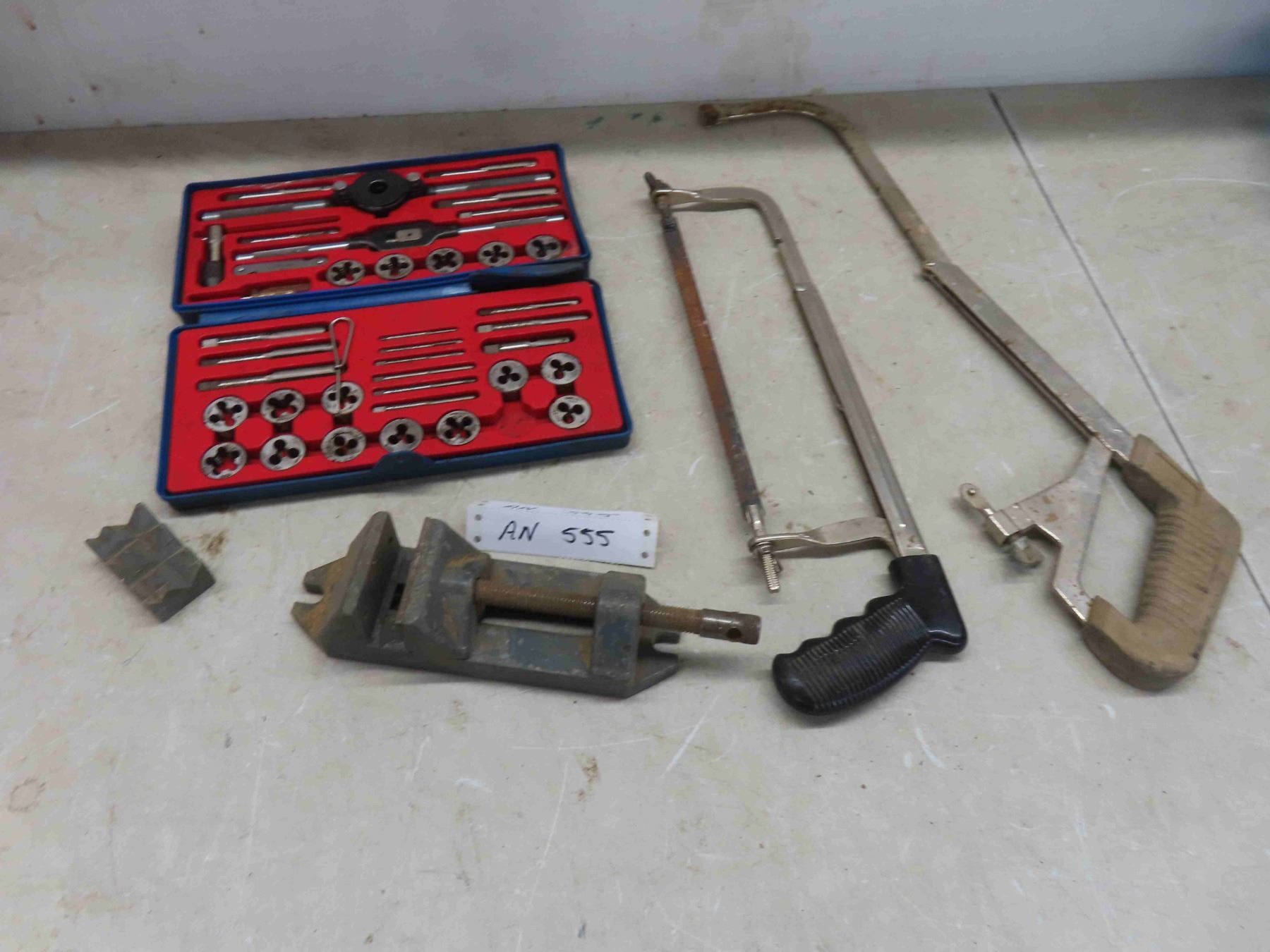 tap and die set, 2 hack saw, 1 missing blade, drill vise