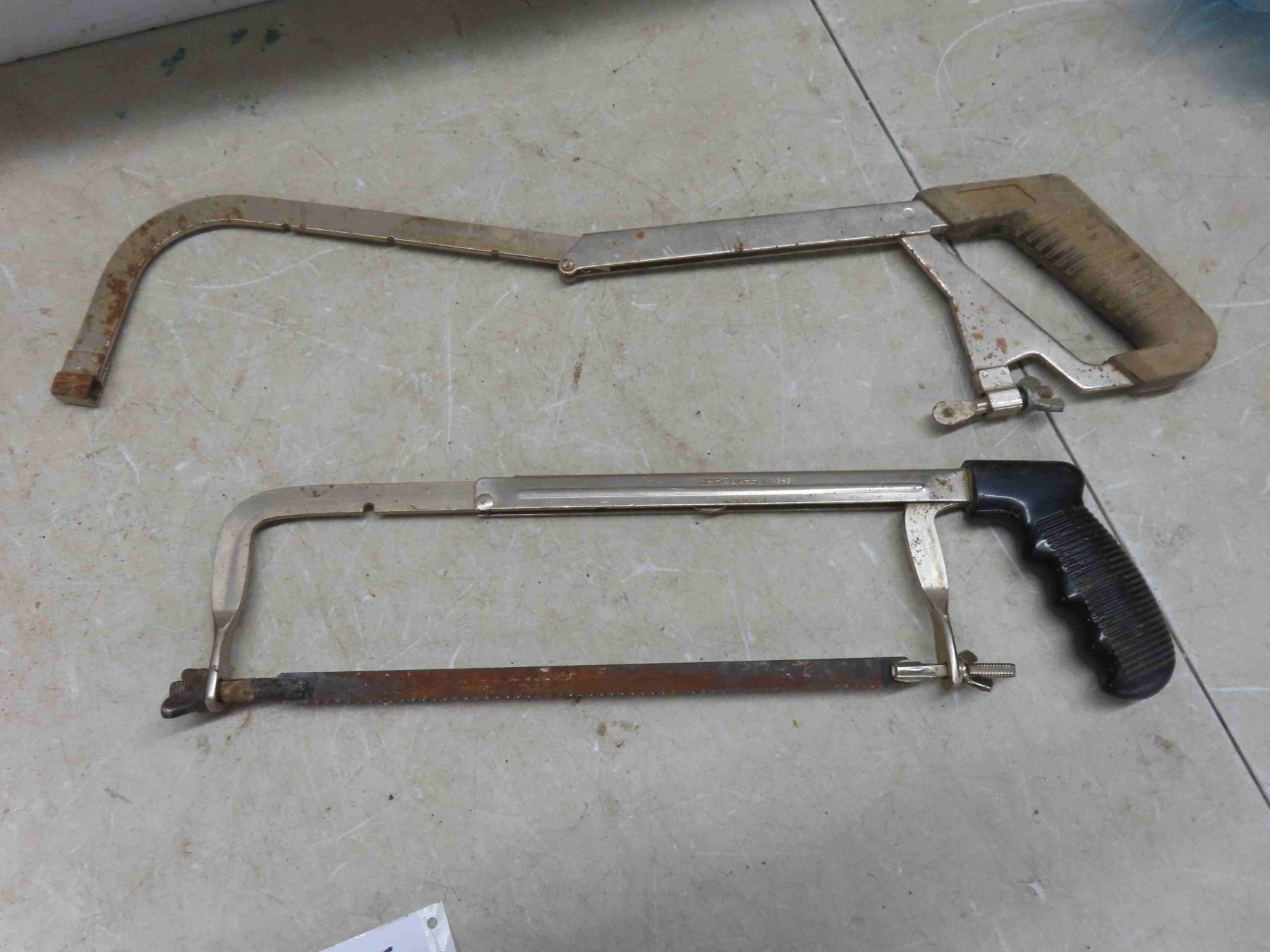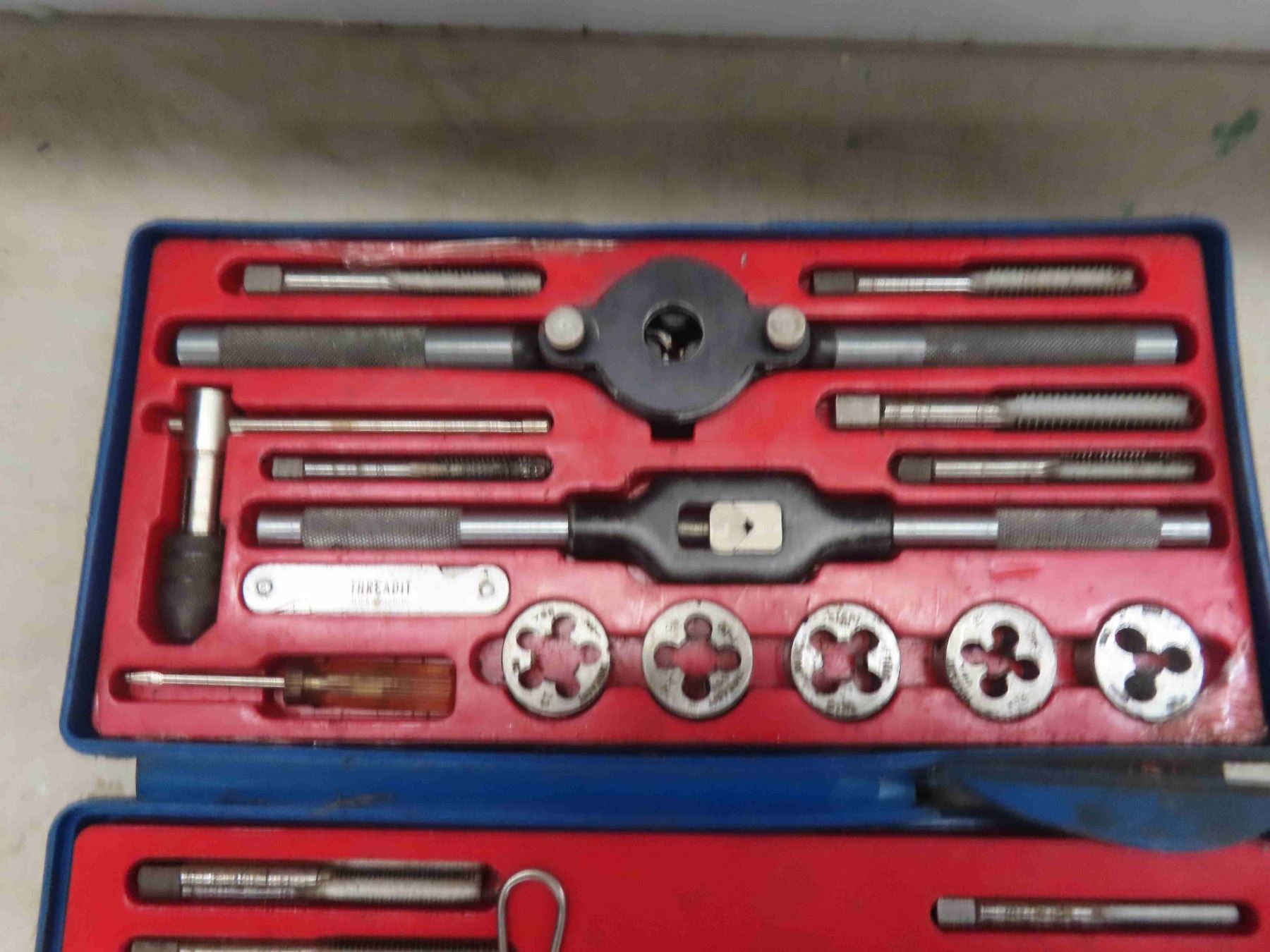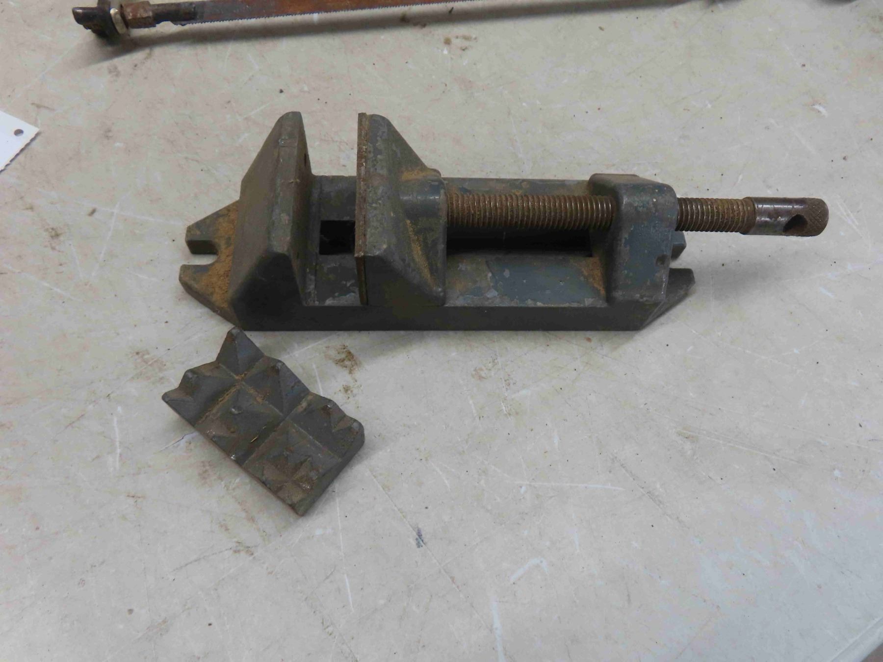 tap and die set, 2 hack saw, 1 missing blade, drill vise