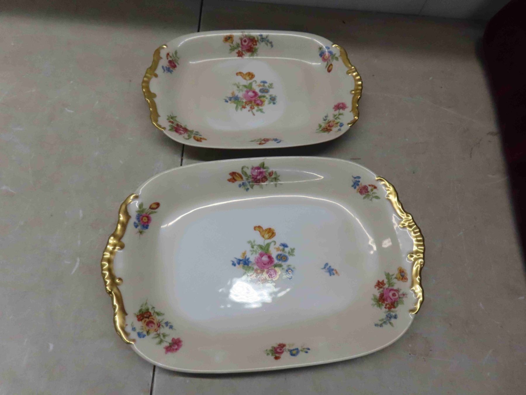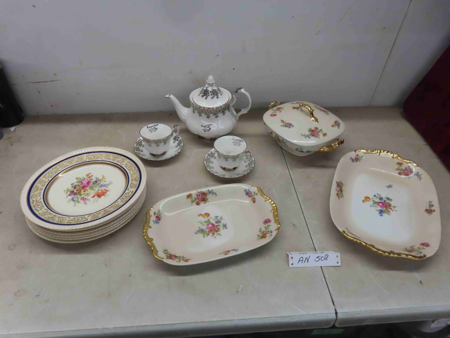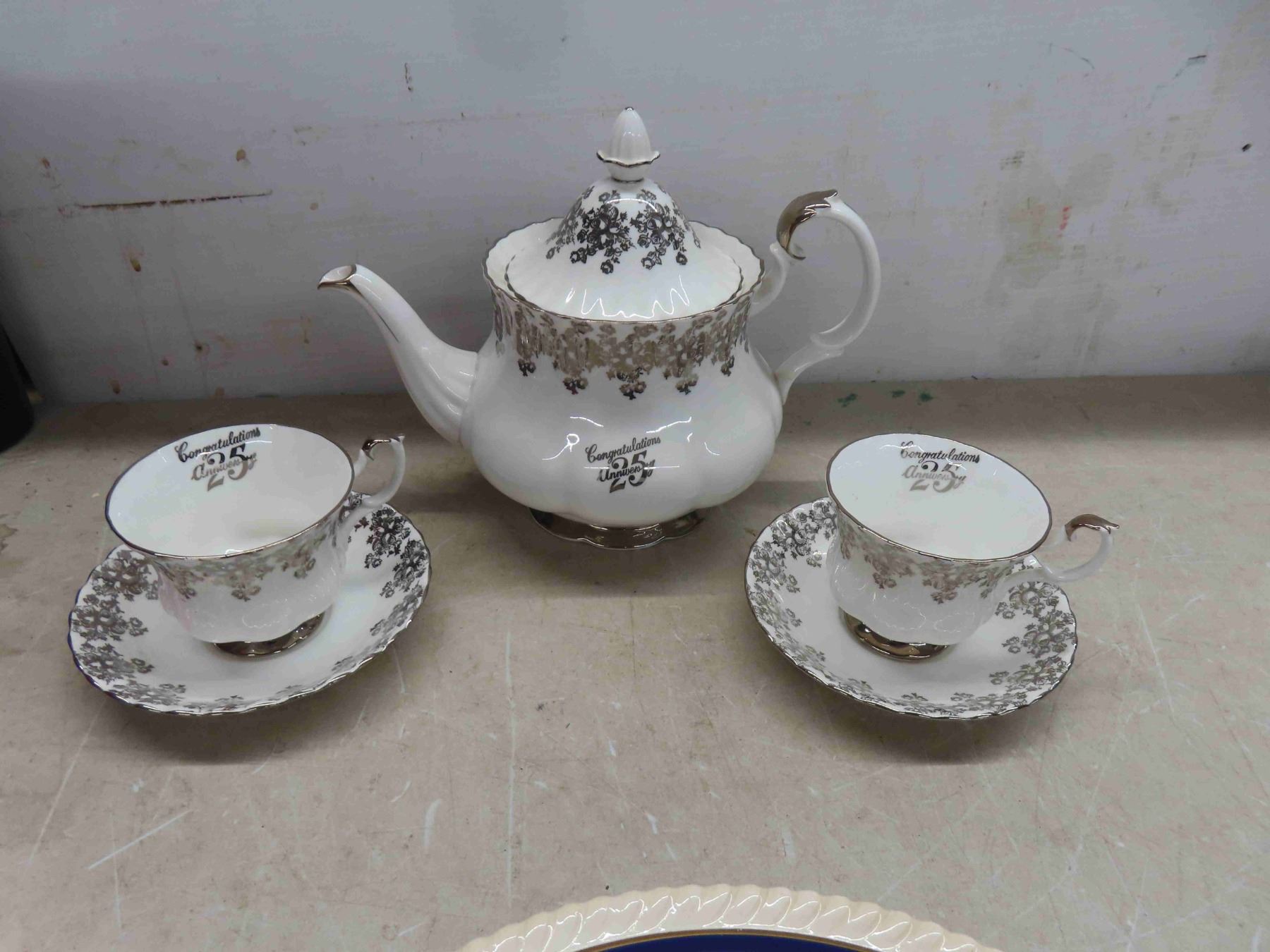 teapot, 2 tea cups with saucers 25th anniversary 3 pieve serving ware, and 7 china dinner plates