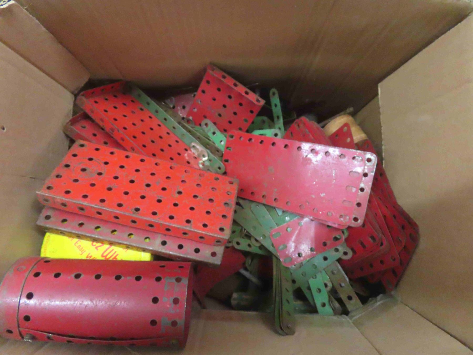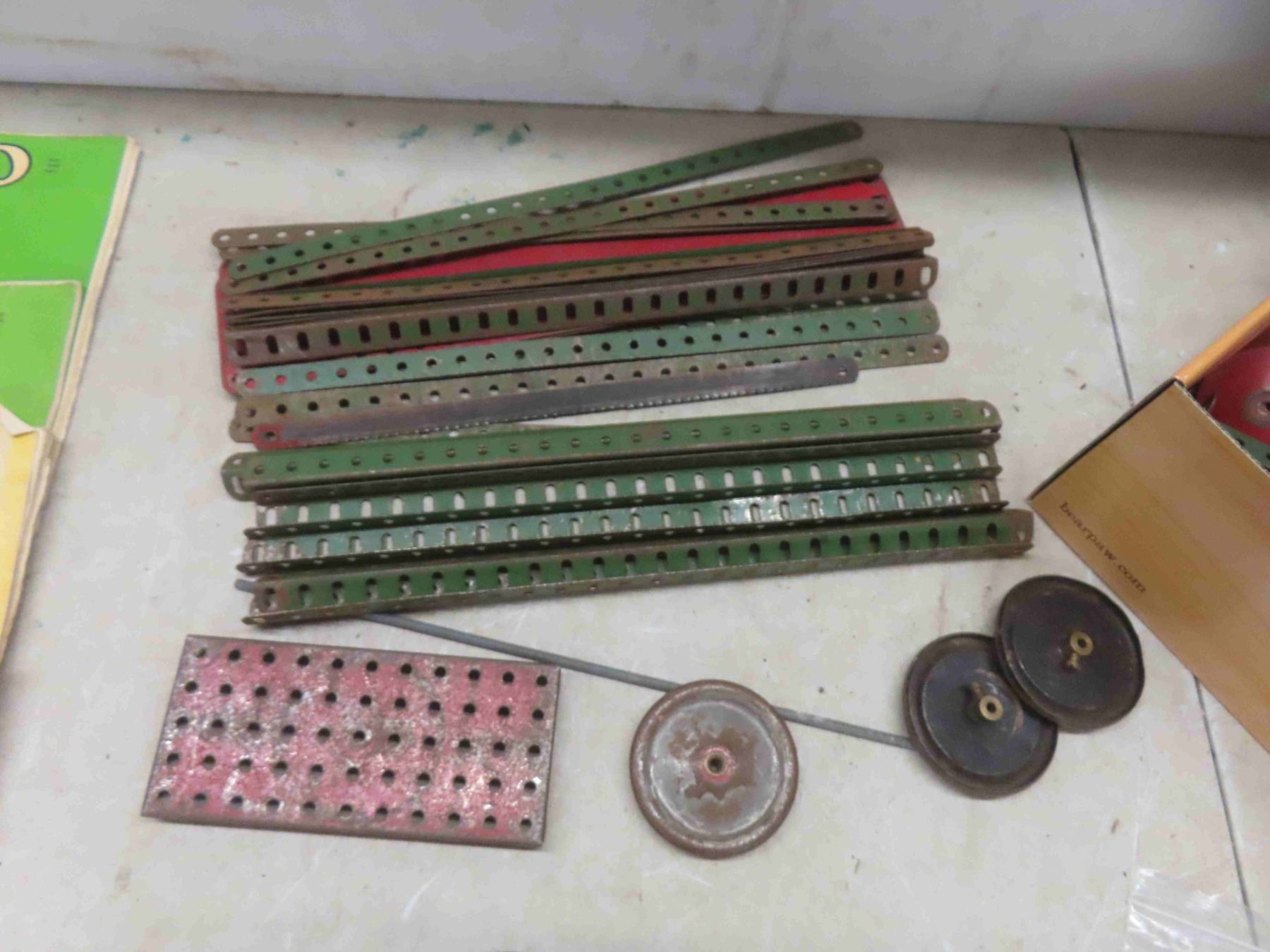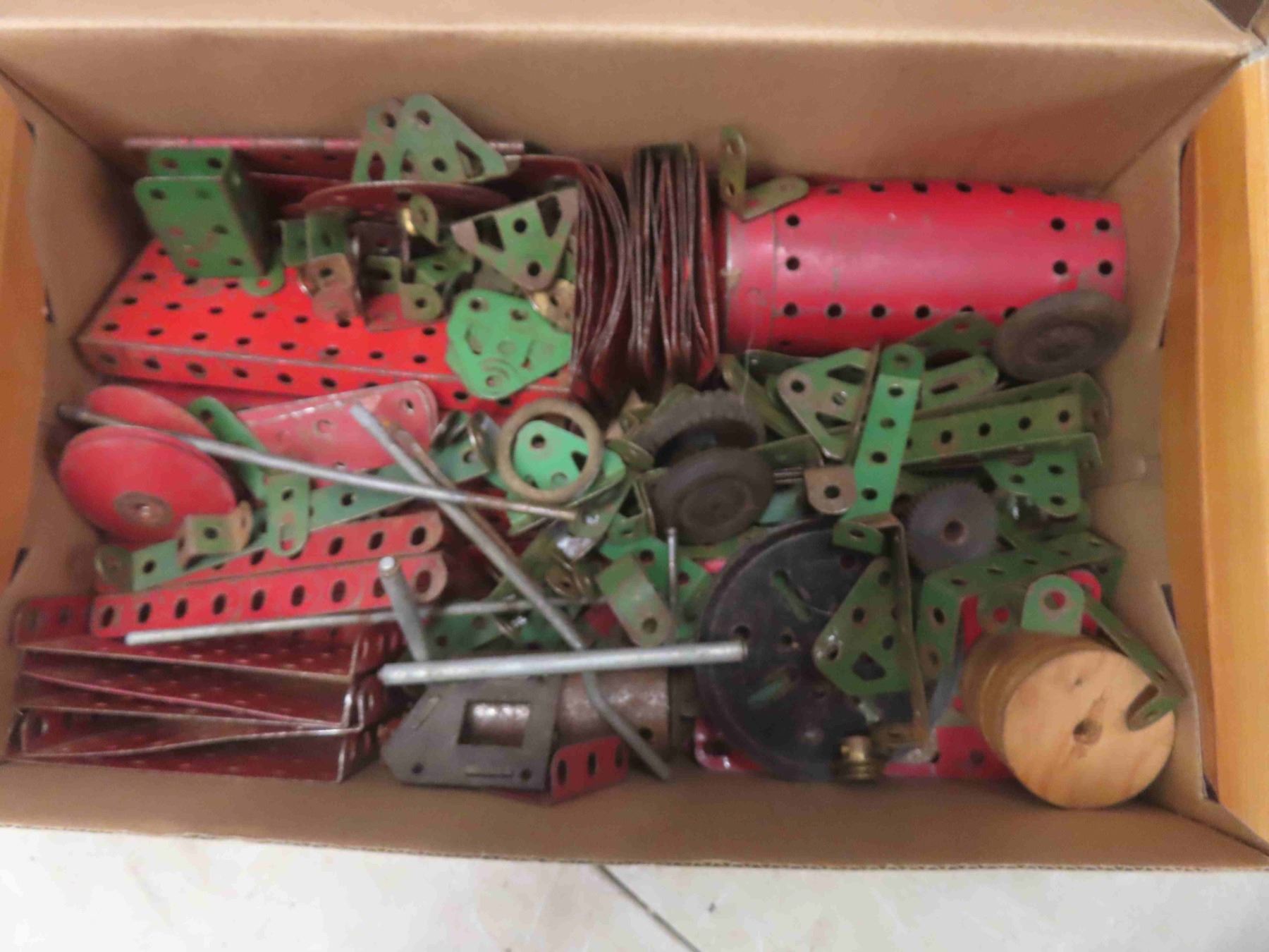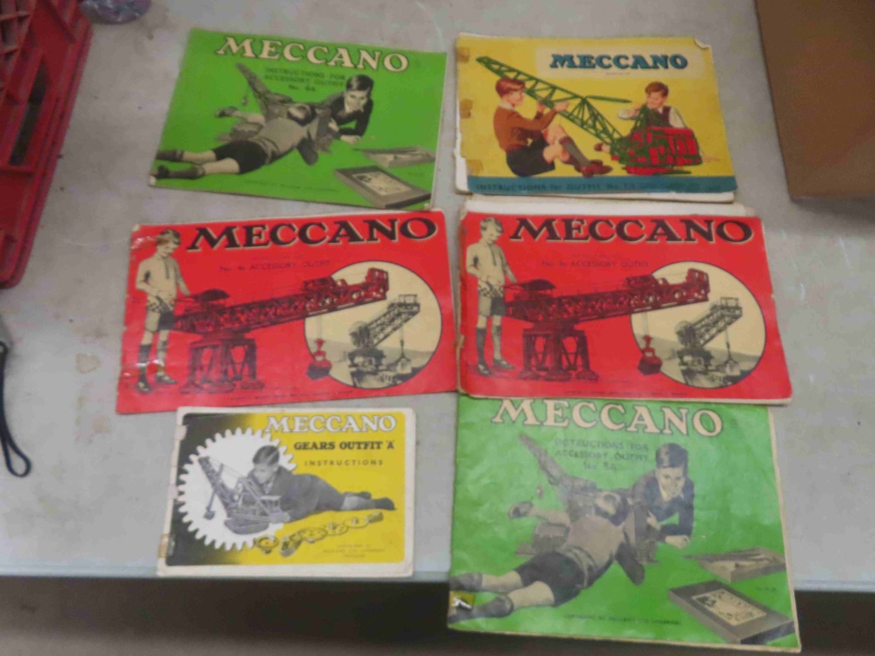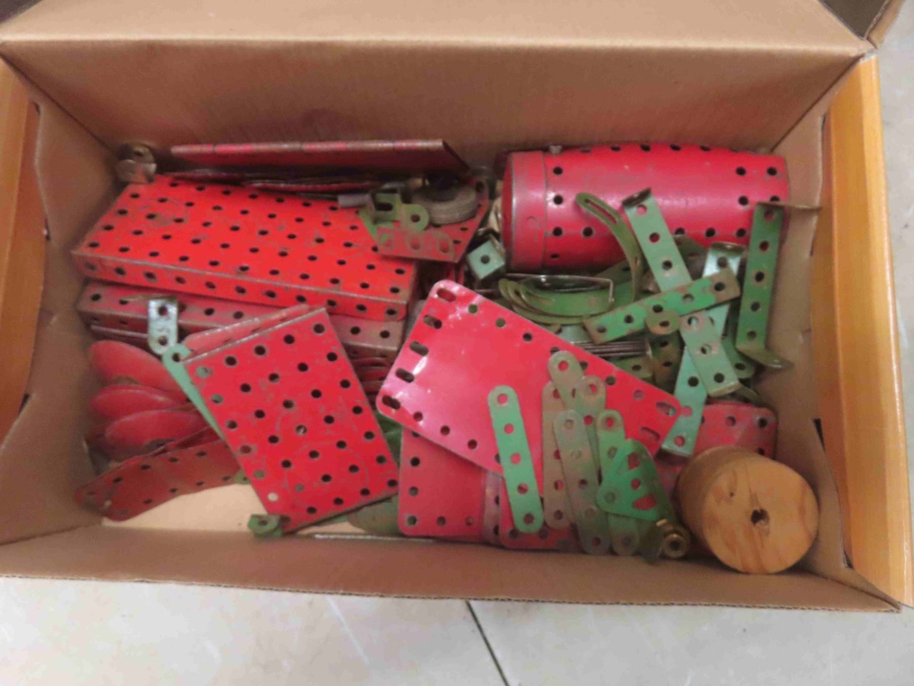 vintage box full of meccano, instruction booklets and all the kinds of parts