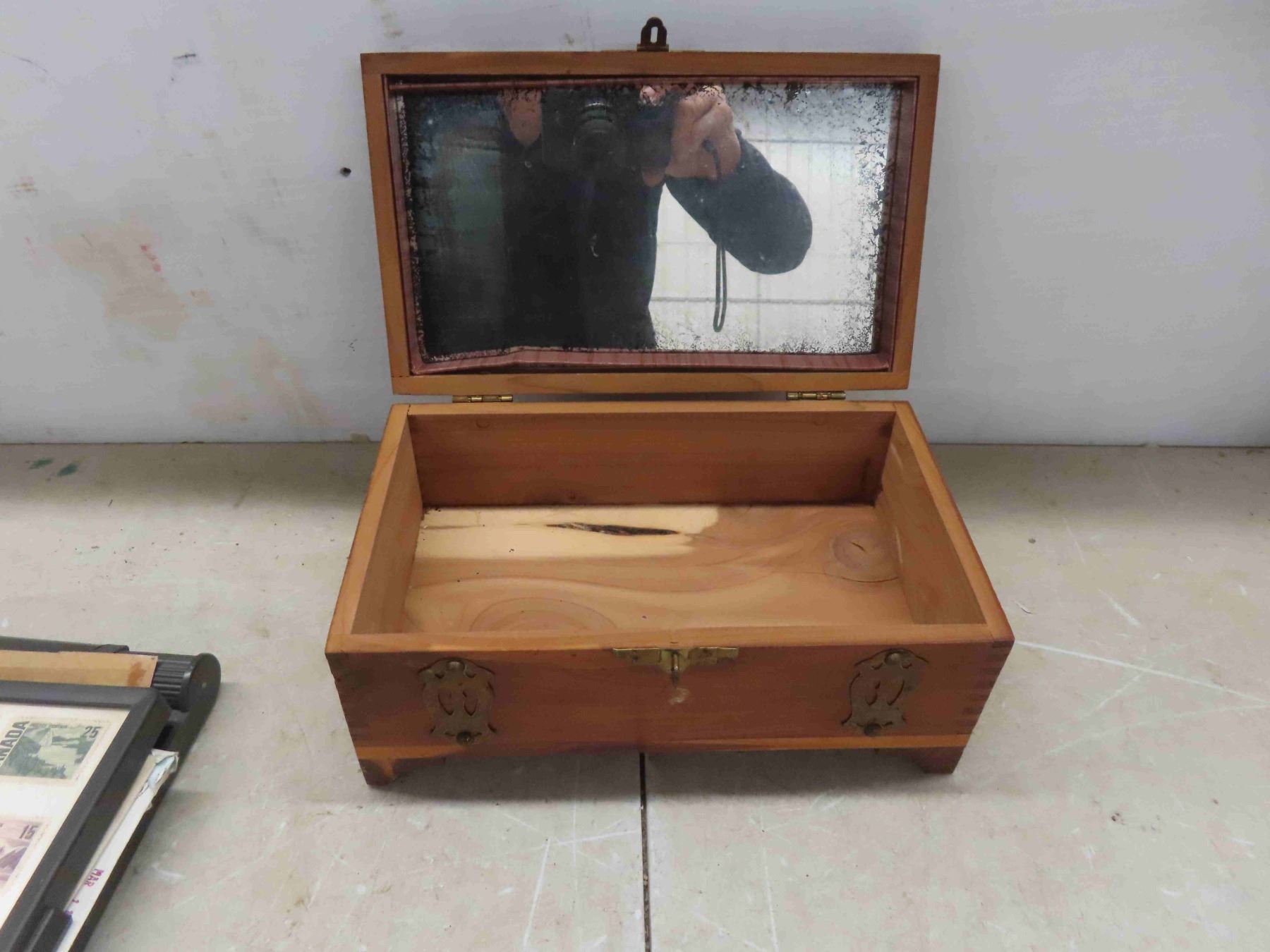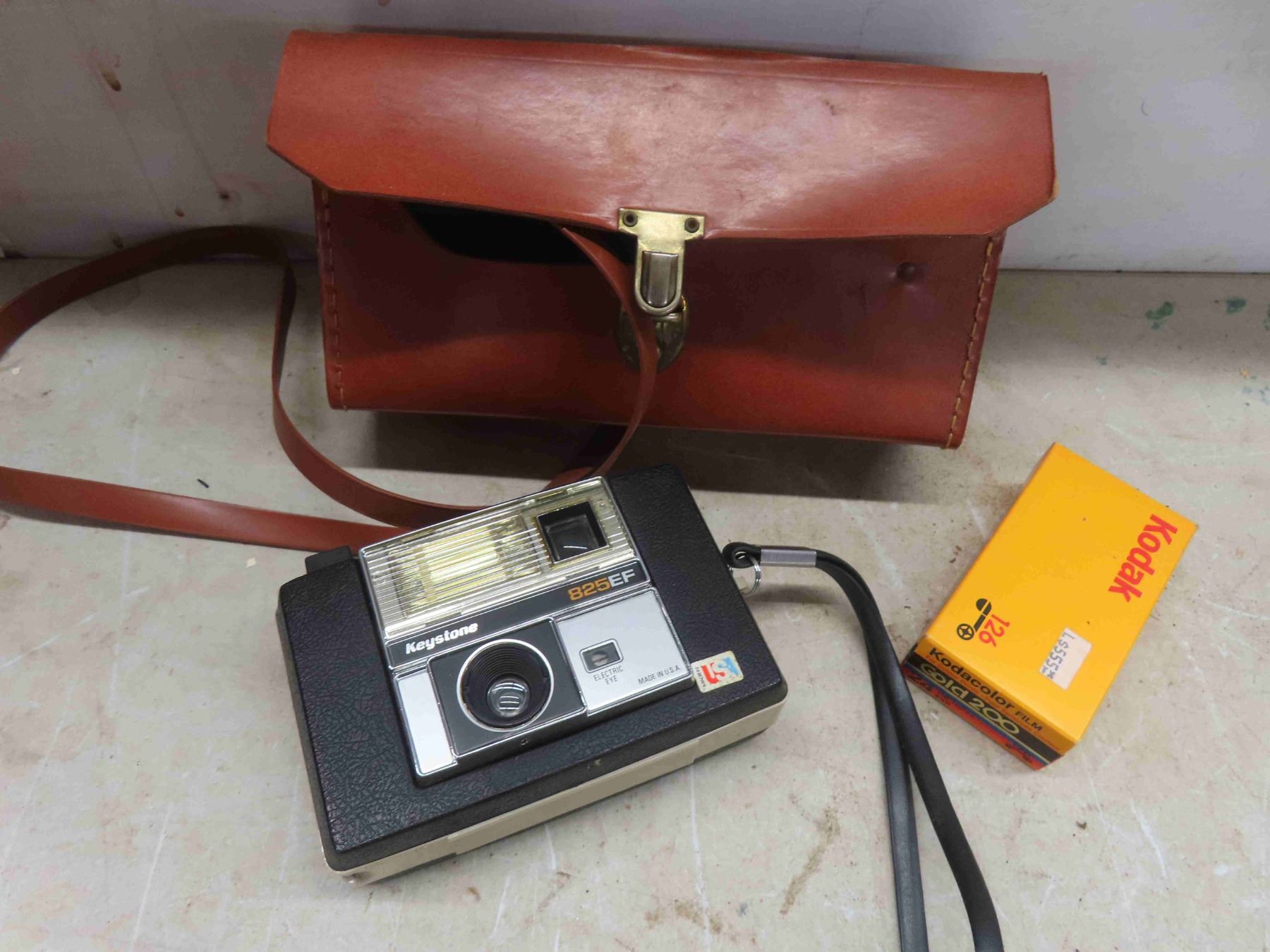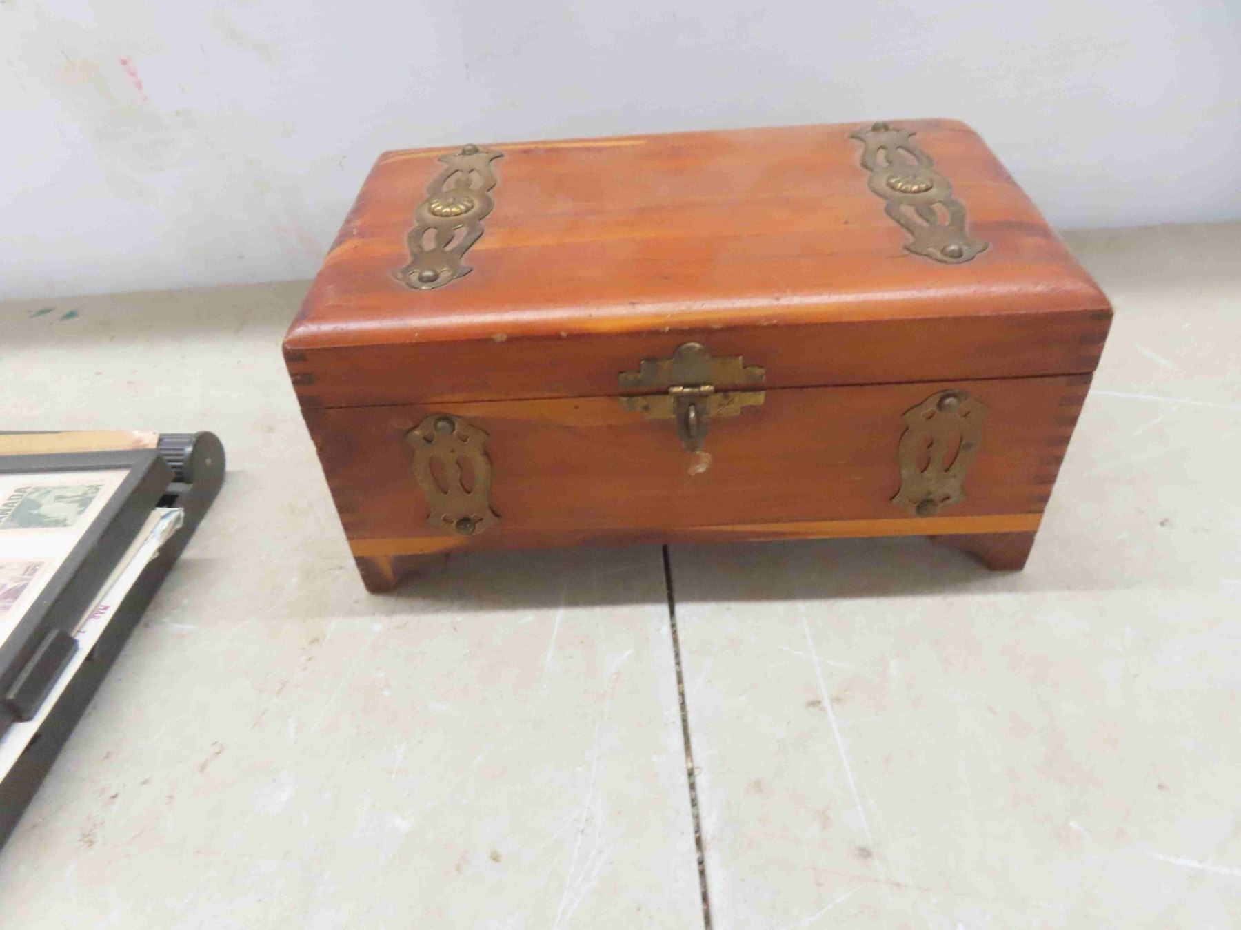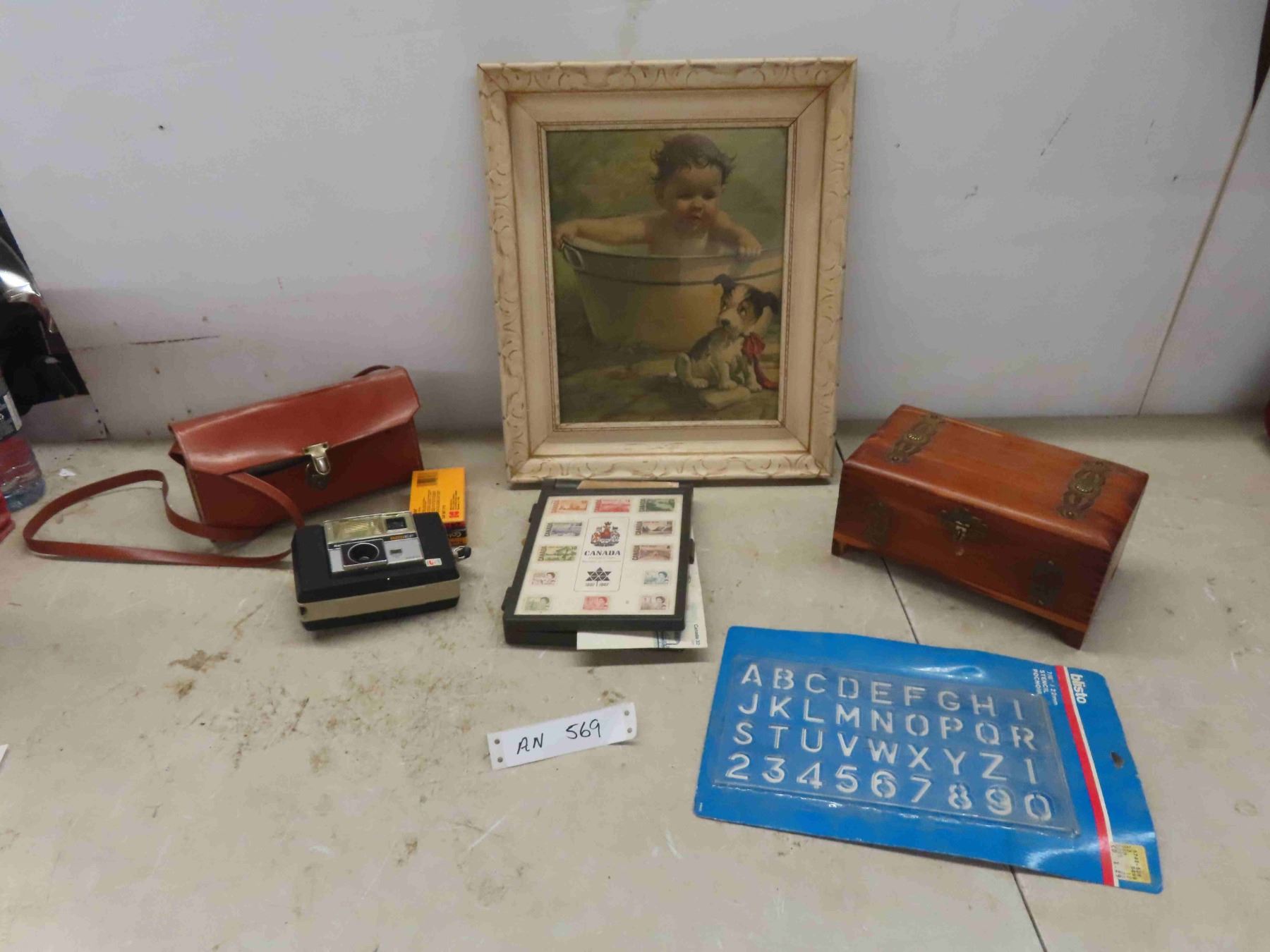 vintage kipstone camers with film and case, wood treasure box, picture 13x6 and canadian stamps