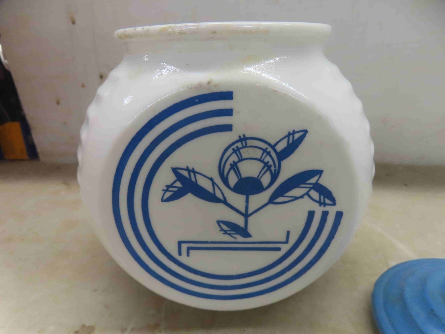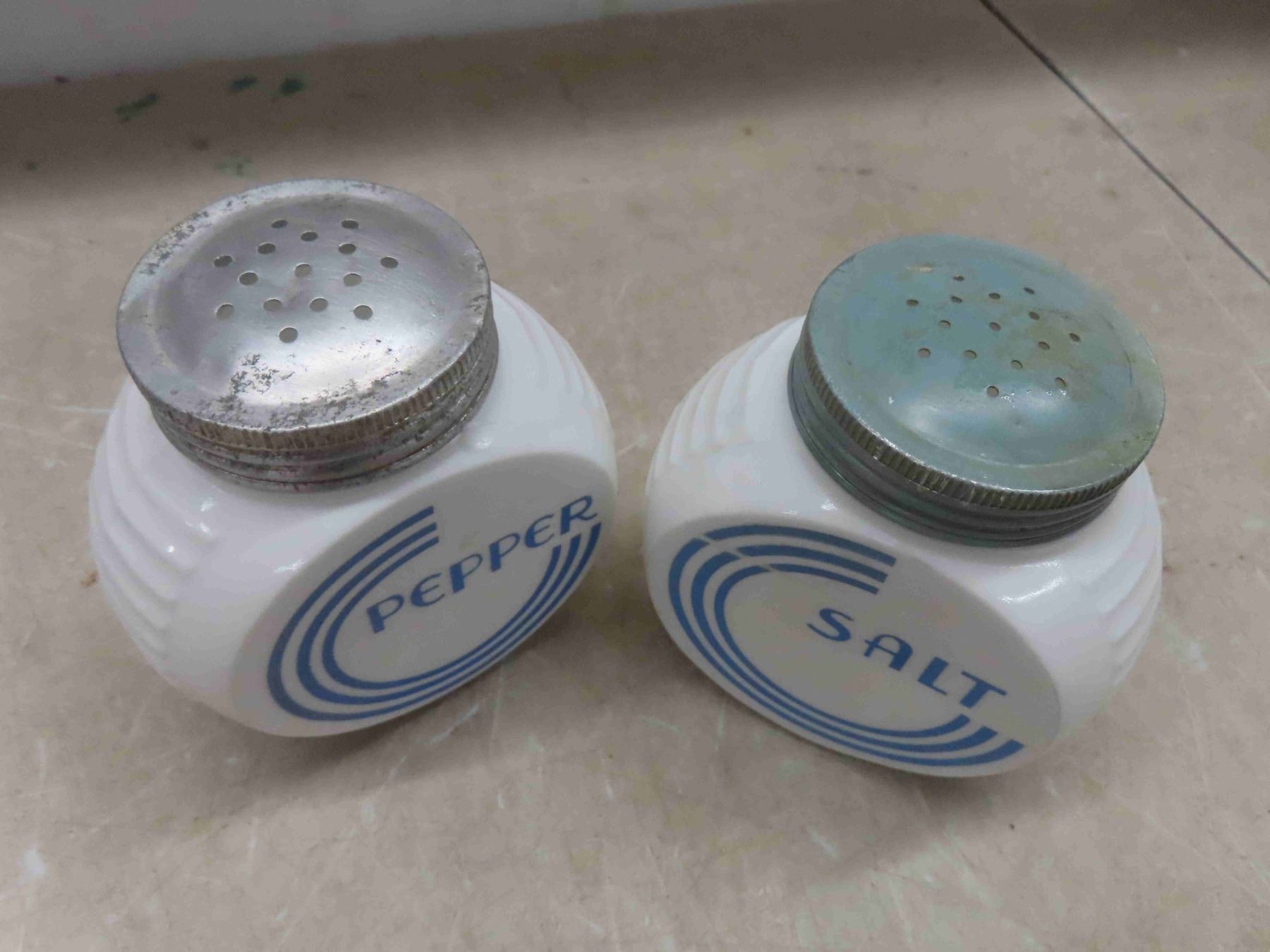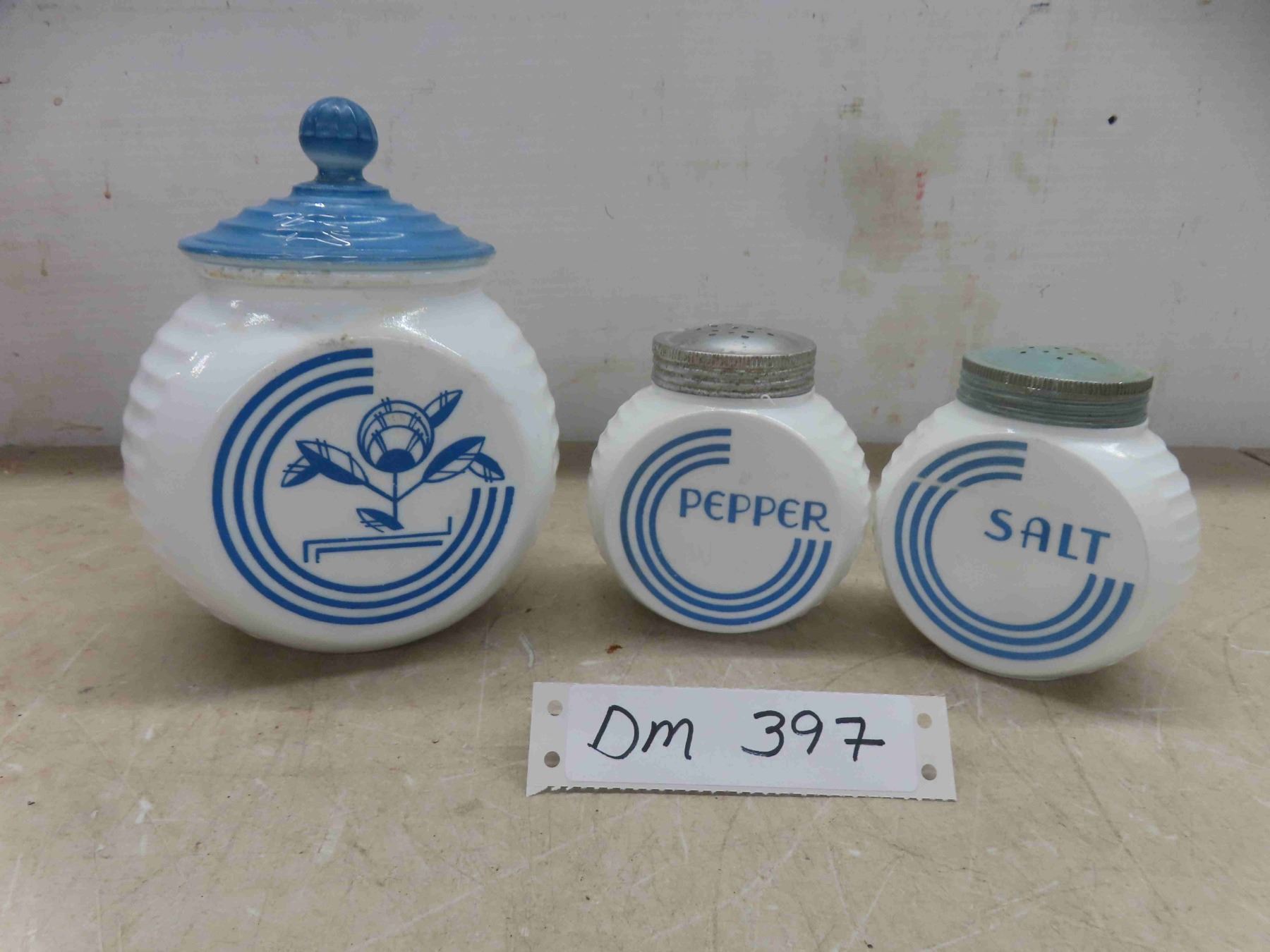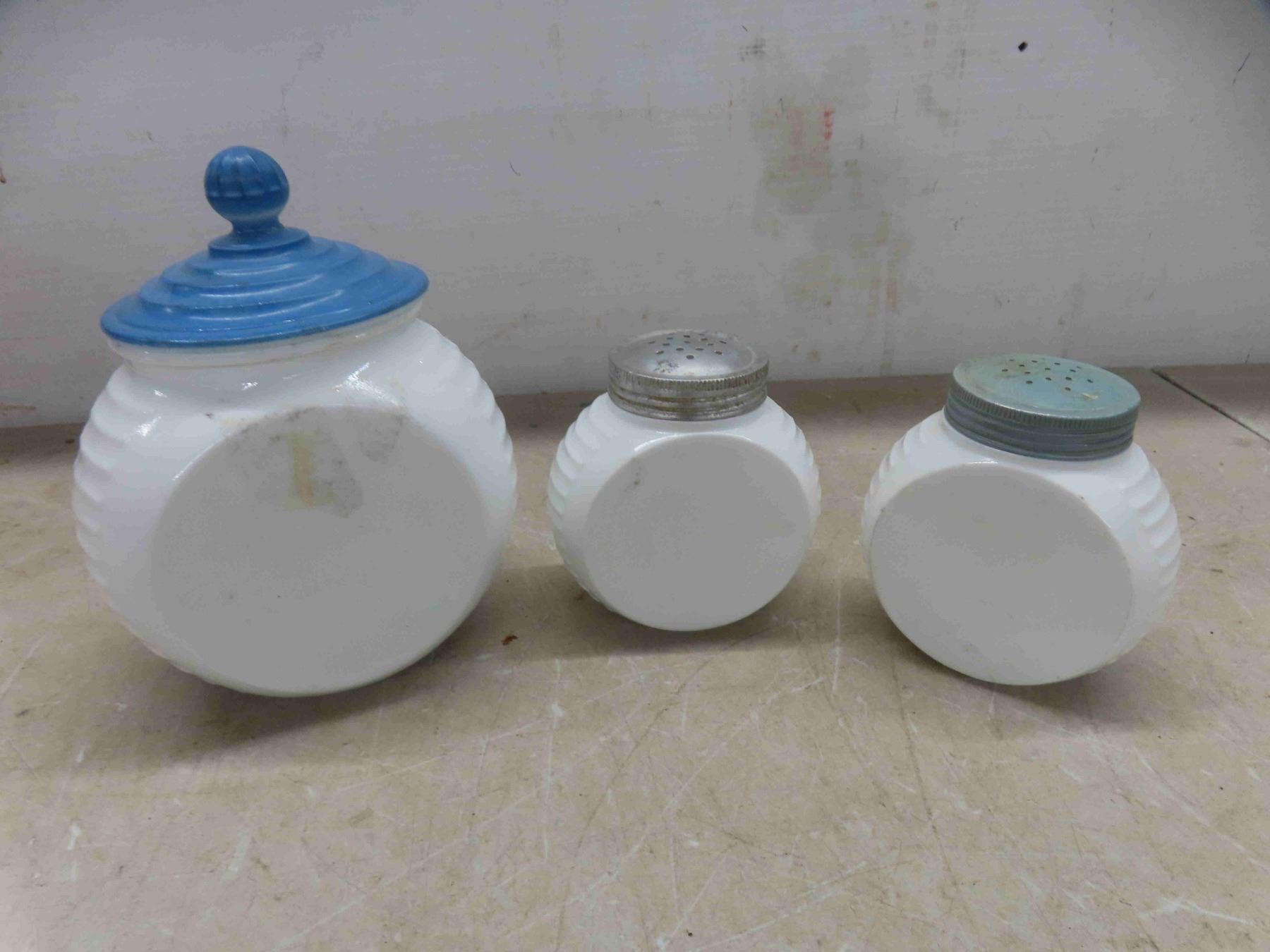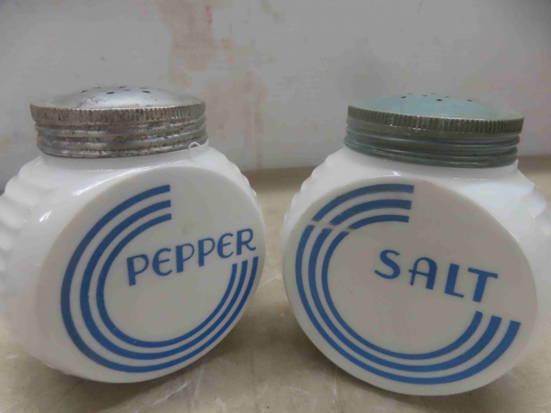 vintage milk glasses salt and pepper shakers, and grease jar