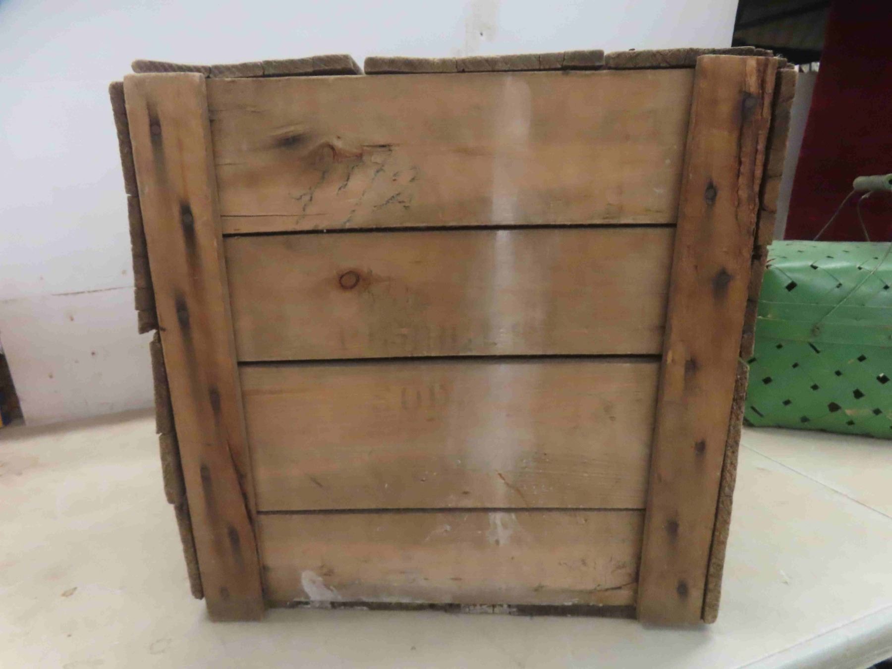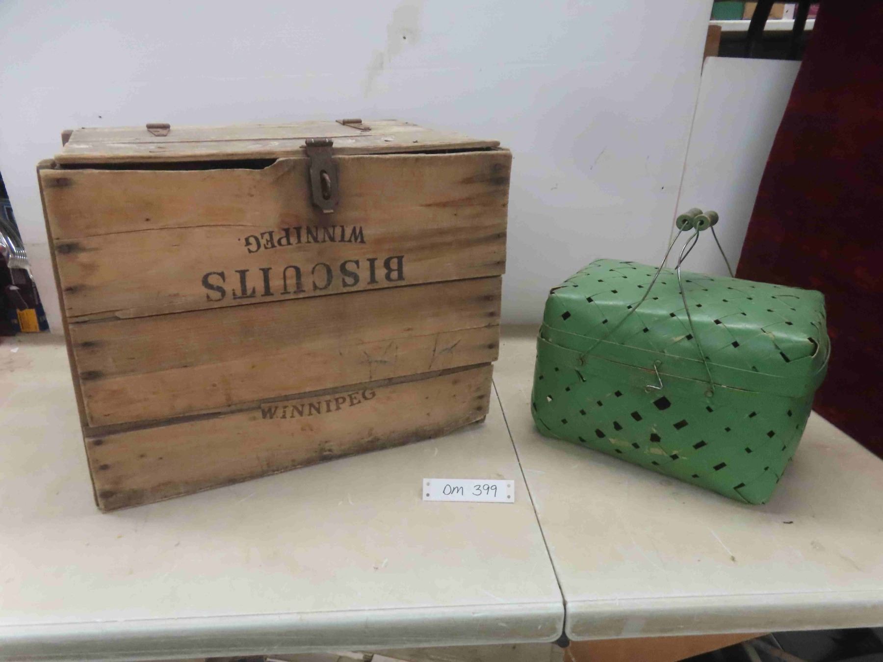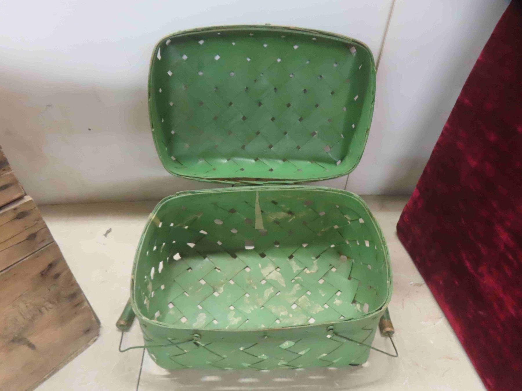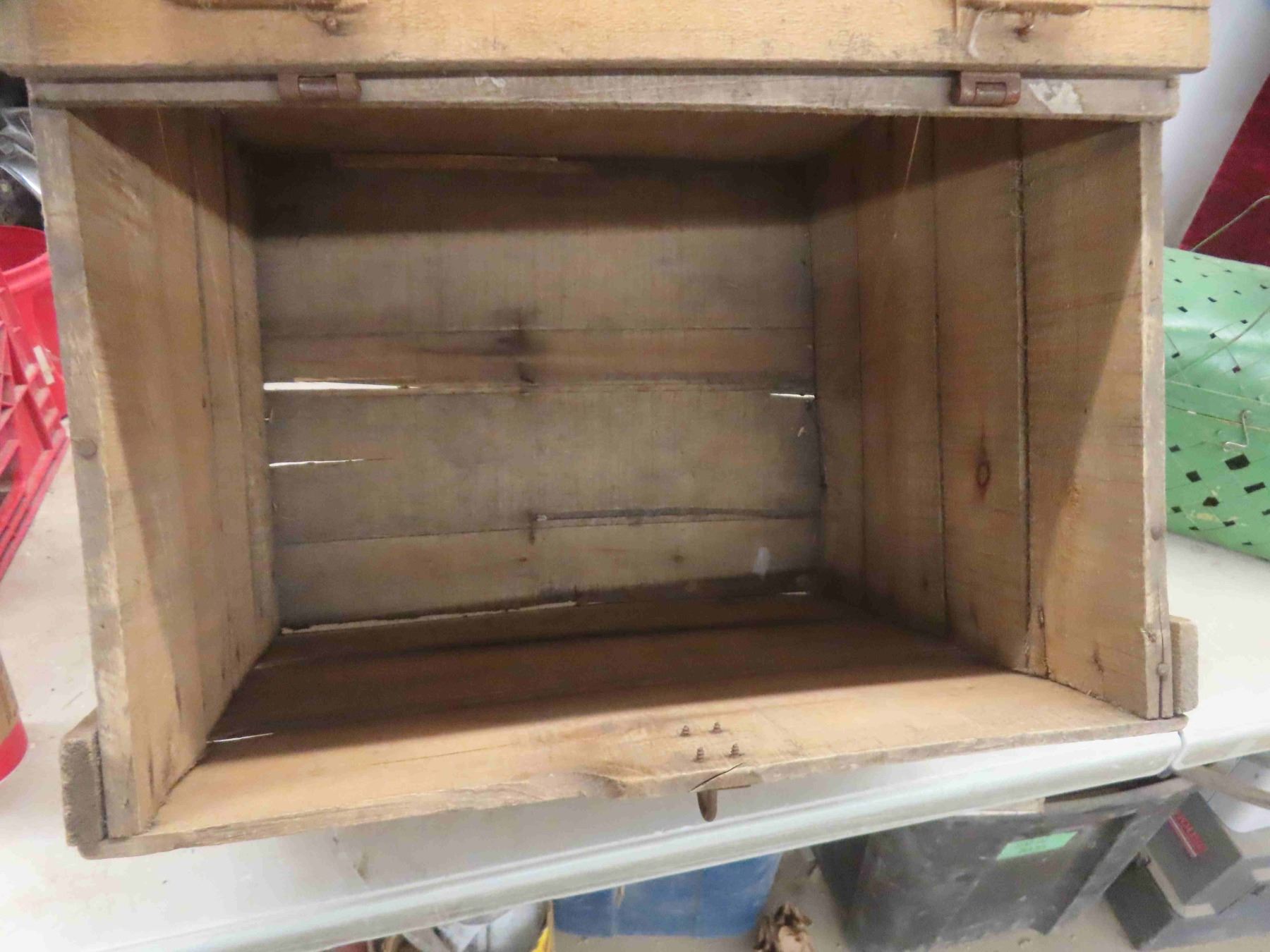 wood crate with hinged lid 20x15x15" and vintage woven split wood picnic basket