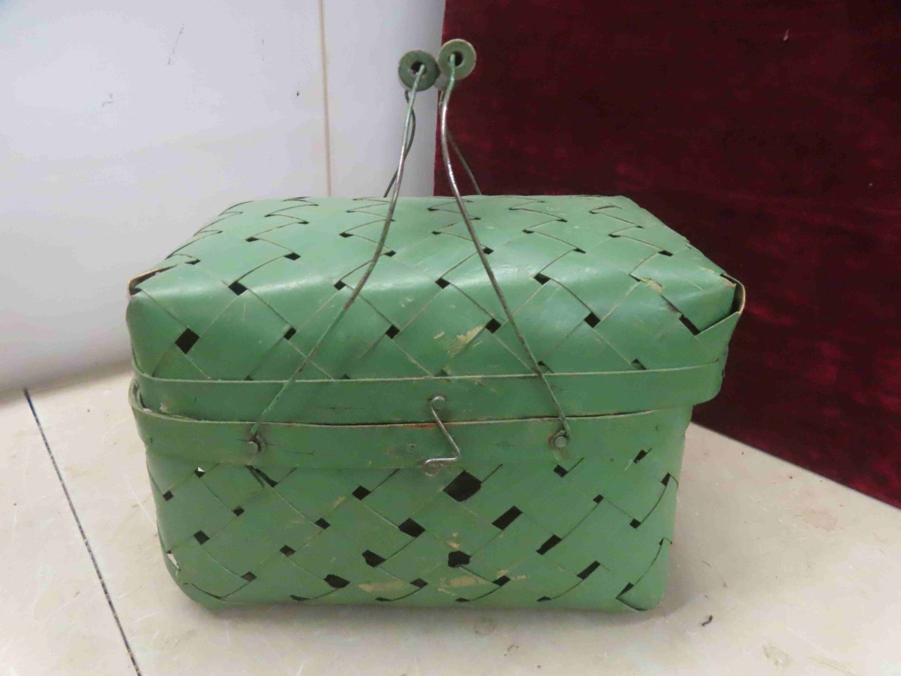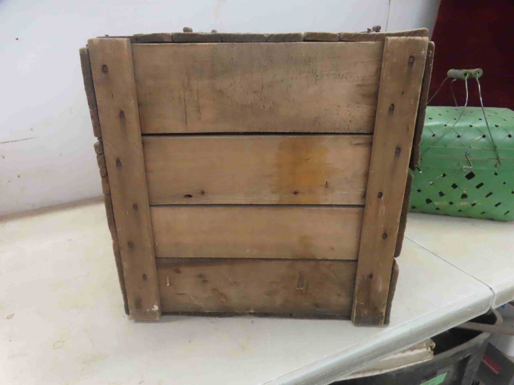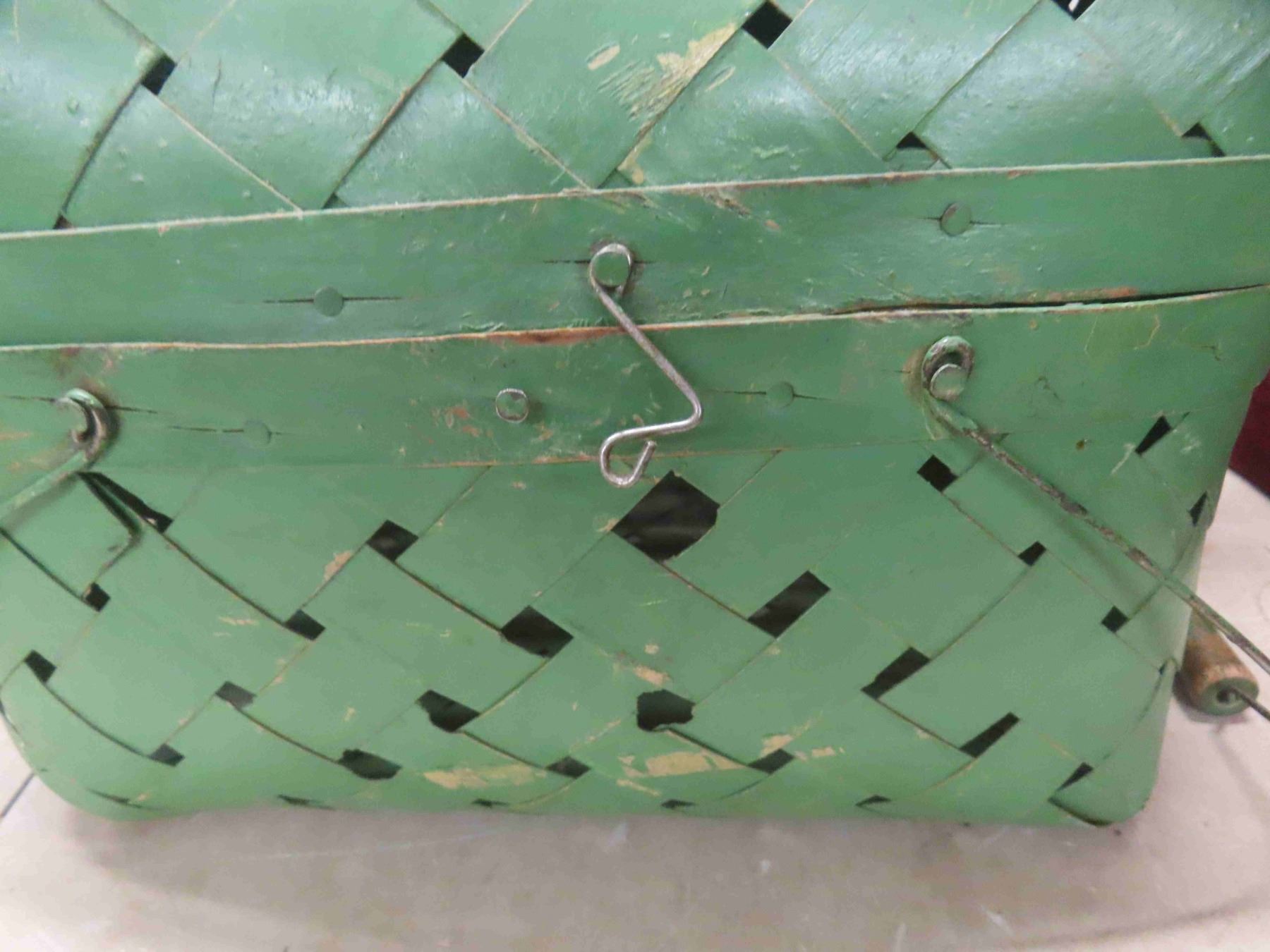 wood crate with hinged lid 20x15x15" and vintage woven split wood picnic basket