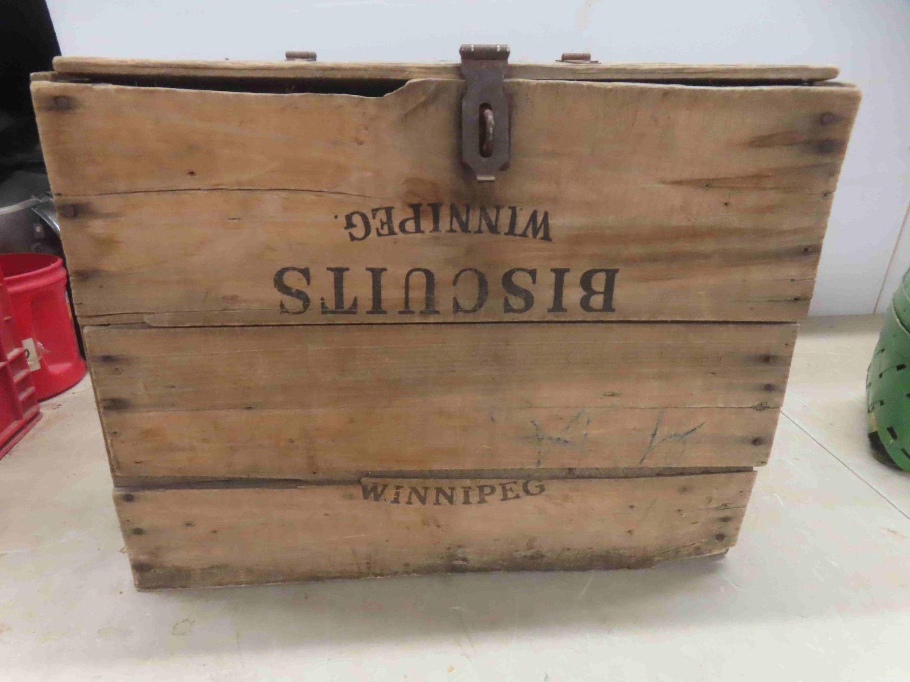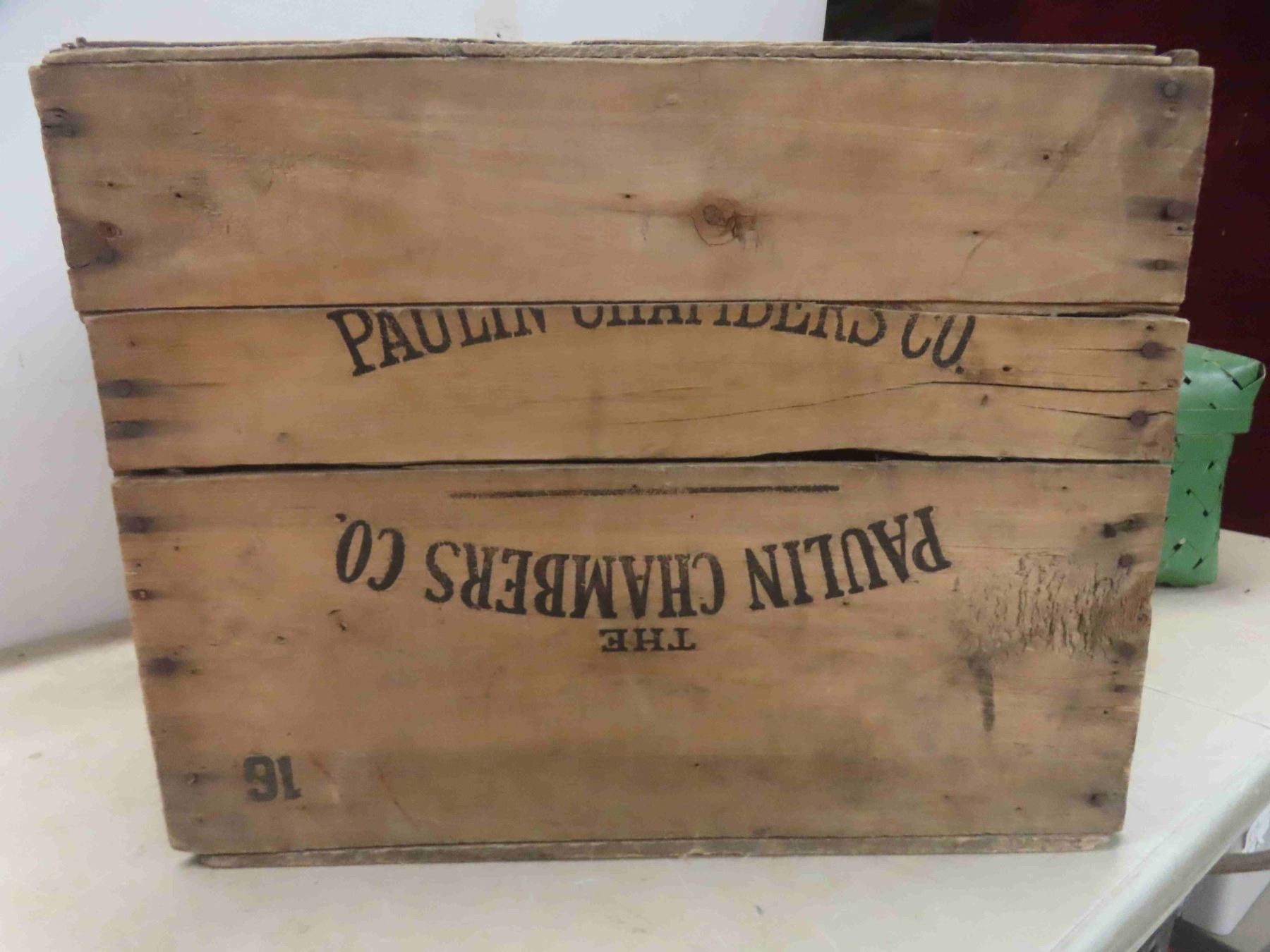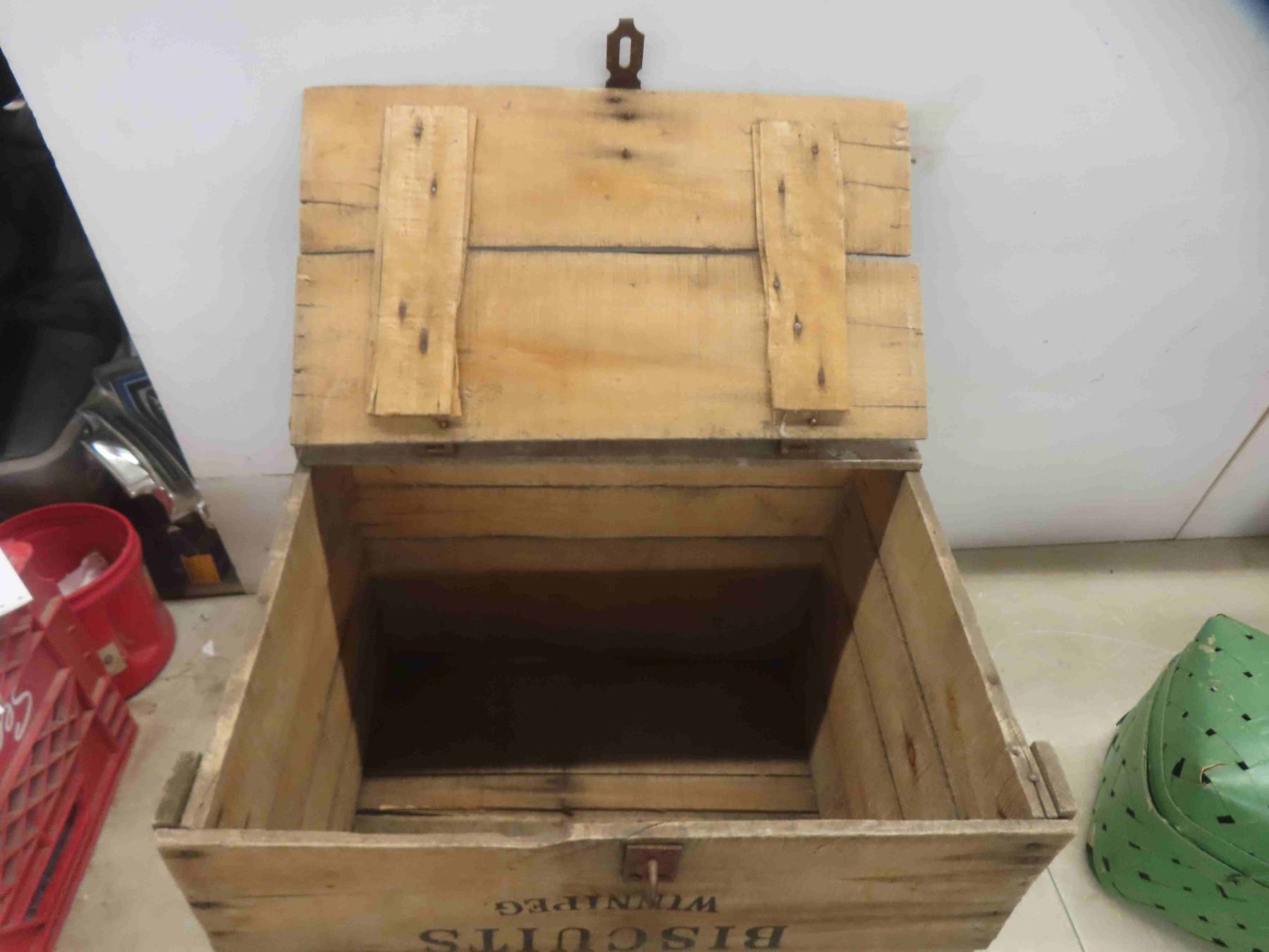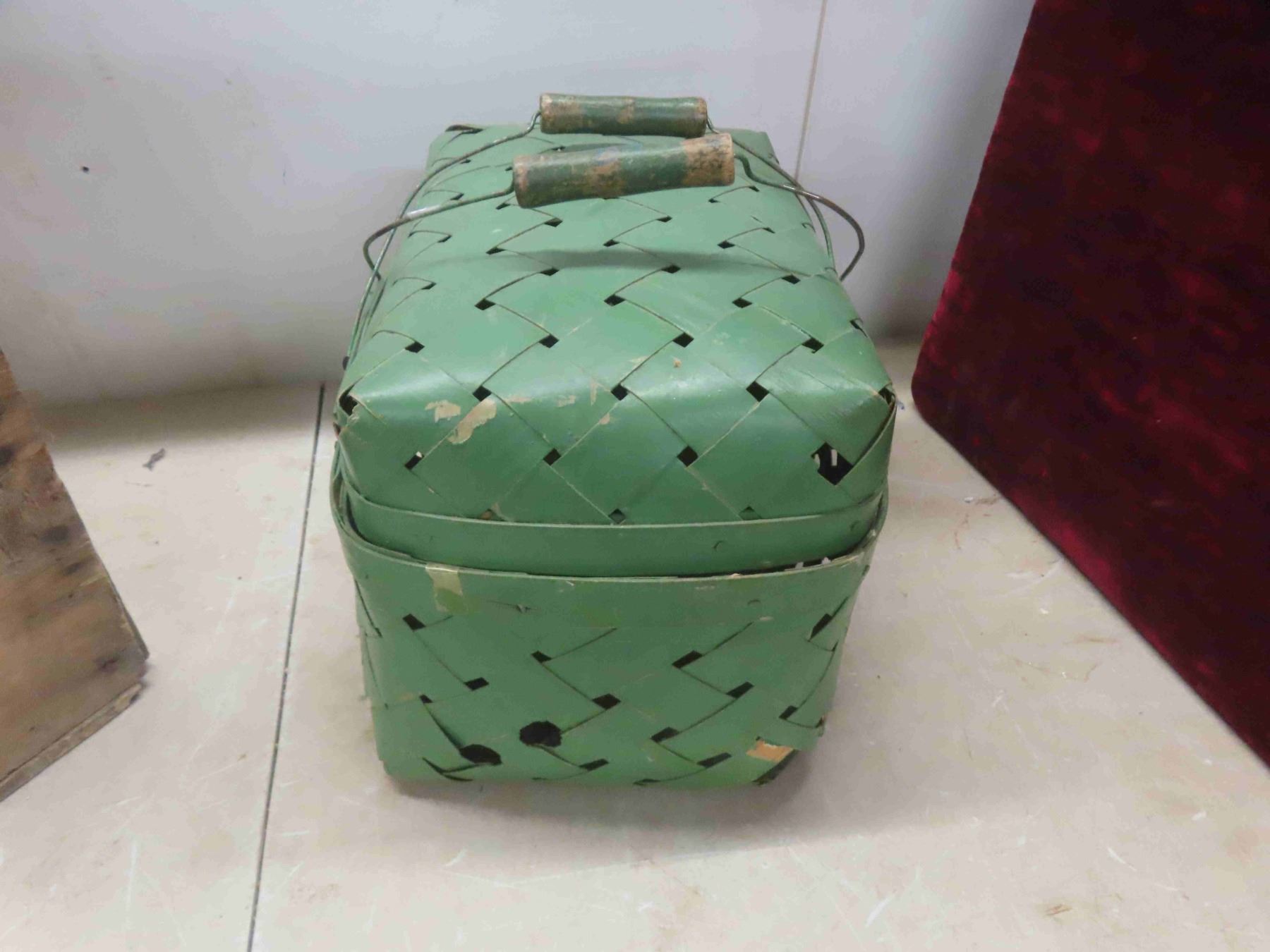 wood crate with hinged lid 20x15x15" and vintage woven split wood picnic basket