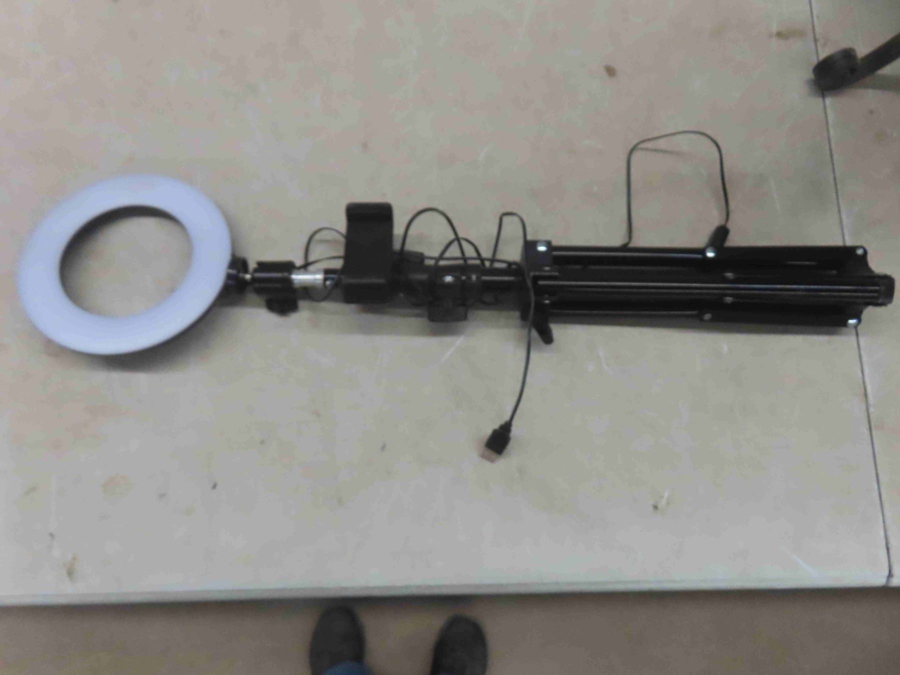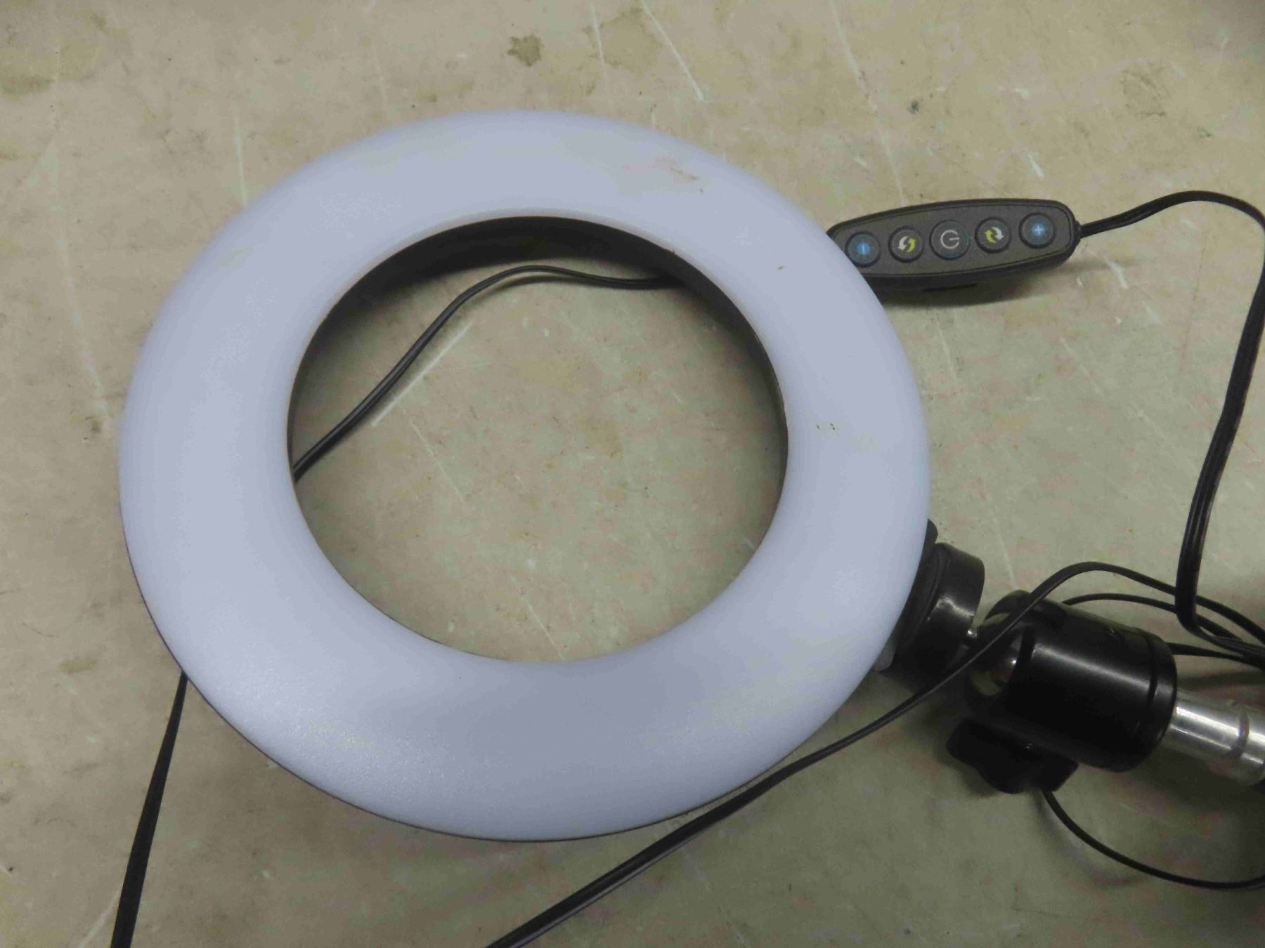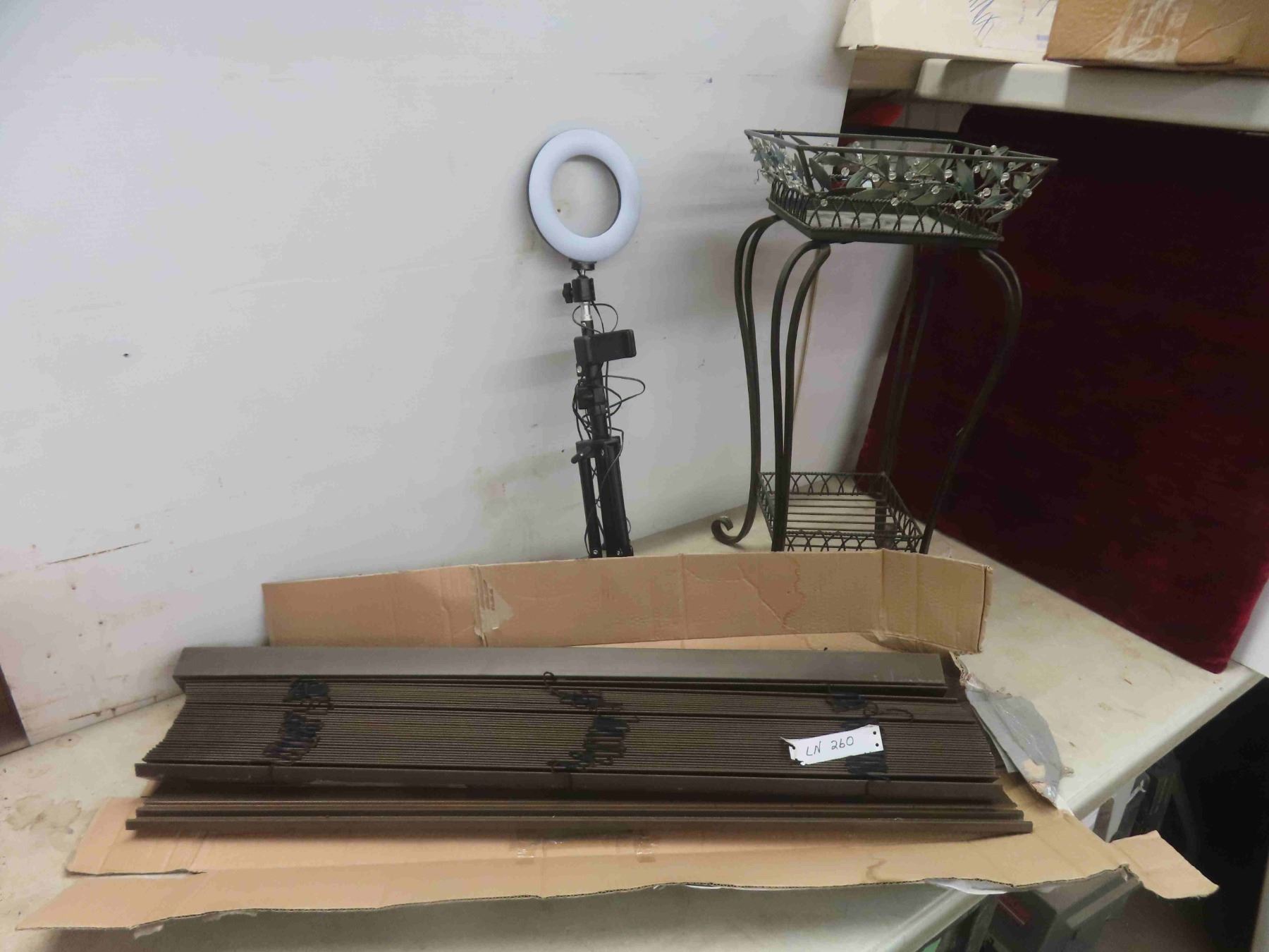 wrought iron plant stand 25"H, 36"W, 64". Faux wood 2" blind, ring light on tripod